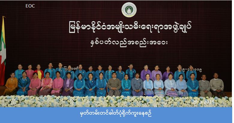 ပြည်ထောင်စုဝန်ကြီးက အမျိုးသမီးများ၏ ဘဝလုံခြုံမှုနှင့် ဖွံ့ဖြိုးတိုးတက်မှုအတွက် မြန်မာနိုင်ငံ အမျိုးသမီးရေးရာအဖွဲ့ချုပ်က ရည်ရွယ်ချက်ထားရှိ၍ ကျယ်ကျယ်ပြန့်ပြန့် ဆောင်ရွက်နေမှုသည် အမျိုးသမီးများ၏အရေးကို အစိုးရက အလေးထားဆောင်ရွက်နေမှု များနှင့် ထပ်တူကျပါကြောင်း၊ အစိုးရအနေဖြင့် အမျိုးသမီးထုတစ်ရပ်လုံး အခွင့်အရေးများ ရရှိရေး၊ လုံခြုံစိတ်ချစွာနေထိုင်ရေး၊ ဖွံ့ဖြိုးတိုးတက်ရေးတို့အတွက် အမျိုးသမီးများ တန်းတူညီ မျှခံစားရရှိရေး၊ အမျိုးသမီးများ၏ ပါဝင်ခွင့်ပိုမိုရရှိရေးတို့ကို မူဝါဒများ၊ ဥပဒေများ၊ မဟာဗျူဟာ များ၊ လုပ်ငန်းစဉ်များချမှတ်၍ အကောင်အထည်ဖော်လျက်ရှိပါကြောင်း၊ အမျိုးသမီးများအရေး ကိုဆောင်ရွက်ရာတွင်အစိုးရဌာနများ၊ အစိုးရမဟုတ်သောအဖွဲ့အစည်းများ အပြင် အရပ်ဖက် အဖွဲ့အစည်းများ၏ ပါဝင်ဆောင်ရွက်မှုသည် အရေးကြီးသဖြင့် အမျိုးသမီးထုအတွက် အပြောင်းအလဲကိုဖော်ဆောင်ရန်နှင့် အားလုံးစုပေါင်းဆောင်ရွက်၍ အောင်မြင်မှုပိုမို ရရှိနိုင်ရန် ရည်ရွယ်လျက် မြန်မာနိုင်ငံလုံးဆိုင်ရာအမျိုးသမီးကော်မတီ အမည်သစ်ဖြင့် အစိုးရ ဦးဆောင်သော ယန္တရား တစ်ရပ်ကို ၂၀၁၈ ခုနှစ် ဇွန်လ(၂၀)ရက်နေ့တွင် ပြန်လည်ဖွဲ့စည်း ခဲ့ပါကြောင်း၊ ထိုမြန်မာ နိုင်ငံလုံးဆိုင်ရာအမျိုးသမီးကော်မတီတွင် ဌာနဆိုင်ရာများ၊ အစိုးရ မဟုတ်သော အမျိုးသမီး အဖွဲ့အစည်းများ ဖြစ်သော မြန်မာနိုင်ငံအမျိုးသမီးရေးရာအဖွဲ့ချုပ်၊ မြန်မာနိုင်ငံမိခင်နှင့်ကလေးစောင့်ရှောက်ရေးအသင်း၊ မြန်မာအမျိုးသမီးစီးပွားရေး စွမ်းဆောင်ရှင် များအသင်း၊ မြန်မာနိုင်ငံ အမျိုးသမီးနှင့် ကလေးသူငယ်များဘဝမြှင့်တင်ရေးအသင်း၊ ရင်ခွင်မဲ့ ကလေးငယ်များလျှော့ချရေးနှင့် ကာကွယ်စောင့်ရှောက်ရေးအသင်း၊ ကျားမတန်းတူညီမျှရေး ကွန်ယက်နှင့် အမျိုးသမီး အဖွဲ့အစည်းများကွန်ယက်တို့ ပါဝင်ဖွဲ့စည်းထားပါကြောင်း၊ နိုင်ငံတော်က ဆောင်ရွက်လျက်ရှိသော ပြည်ထောင်စုငြိမ်းချမ်းရေးညီလာခံ ၂၁ ရာစု ပင်လုံ အစည်းအဝေး (၃) ကြိမ်ပြီး မြောက်ခဲ့ရာ ပြည်ထောင်စု၏ သဘောတူညီချက် (၅၁)ချက် ပေါ်ထွက် အတည်ပြုခဲ့ရာတွင် အမျိုးသမီးများအတွက် ကျားမတန်းတူညီမျှရေး၊ အမျိုးသမီး များကို ကာကွယ်စောင့်ရှောက်ရေး၊ အမျိုးသမီးများဖွံ့ဖြိုးတိုးတက်ရေးနှင့် အမျိုးသမီးပါဝင်မှု ၃၀% ရရှိရေးစသည့်အချက်များ ပါဝင်ခဲ့ရာ နိုင်ငံတော်က အမျိုးသမီးများ ရပ်တည်မှုနှင့် ဖွံ့ဖြိုးတိုးတက်ရေးအတွက် အလေးထား ဆောင်ရွက်နေပါကြောင်း၊ မြန်မာနိုင်ငံအမျိုးသမီးရေးရာ အဖွဲ့ချုပ် အနေဖြင့် ပြည်ထောင်စု နယ်မြေ၊ နေပြည်တော်ကောင်စီ အပါအဝင် တိုင်းဒေသကြီး၊ ပြည်နယ်၊ ခရိုင်၊မြို့နယ်အထိ အဖွဲ့များဖွဲ့စည်းဆောင်ရွက်နေခြင်း
