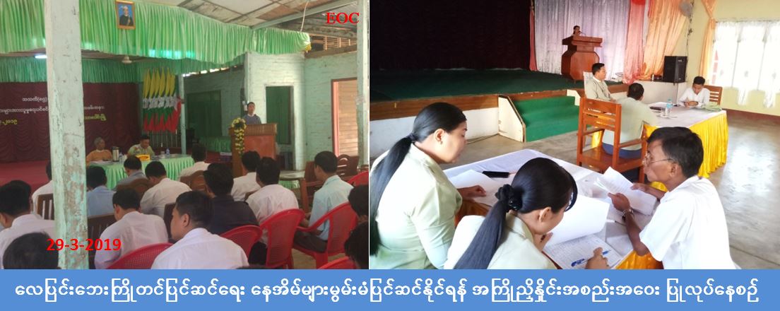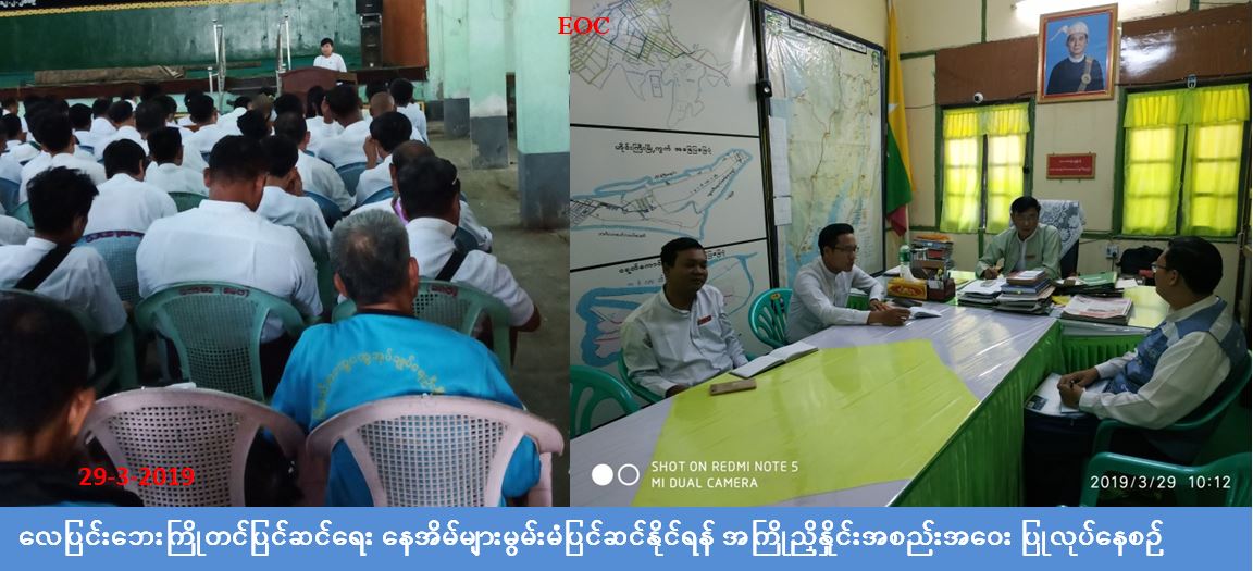လူမှုဝန်ထမ်း၊ ကယ်ဆယ်ရေးနှင့် ပြန်လည်နေရာ ချထားရေးဝန်ကြီးဌာန၊ ဘေးအန္တရာယ်ဆိုင်ရာ စီမံ ခန့်ခွဲမှုဦးစီးဌာန၊ ဧရာဝတီတိုင်းဒေသကြီးဦးစီးမှူးရုံးမှ တာဝန်ရှိသူများ သည် (၂၉-၃-၂၀၁၉)ရက်နေ့၌ (သာပေါင်း၊ ရေကြည်၊ ကျုံပျော်၊ ငပုတော)မြို့နယ် အထွေထွေအုပ်ချုပ်ရေးဦးစီးဌာနတို့၌ လေပြင်း ဘေးကြိုတင်ပြင်ဆင်ရေးအနေဖြင့် နေအိမ်များမွမ်းမံပြင်ဆင်နိုင်ရန်အတွက် အကြိုညှိနှိုင်း အစည်း အဝေးအားကျင်းပခဲ့ရာ လွှတ်တော်ကိုယ်စားလှယ်၊ မြို့နယ် အုပ်ချုပ်ရေးမှူး၊ ဌာနဆိုင်ရာများ၊ ရပ်ကွက်/ ကျေးရွာအုပ်ချုပ်ရေးမှူးများနှင့် ရပ်/ကျေးစာရေးများ တက်ရောက်ခဲ့ပြီး နေအိမ်များမွမ်းမံပြင်ဆင် နိုင်ရေးအတွက် ညှိနှိုင်းတိုင်ပင်ဆွေးနွေးခဲ့ကြောင်း သိရှိရပါသည်။