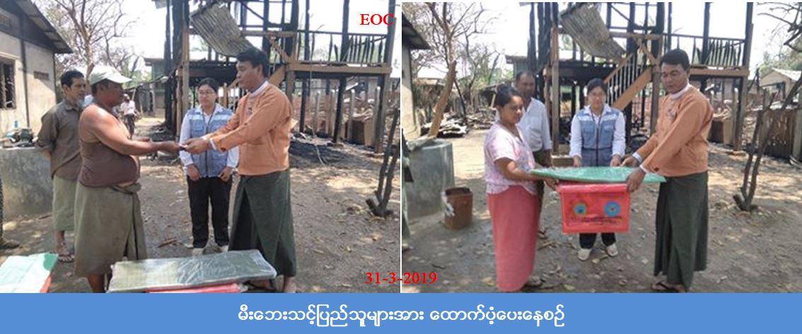 (၃၁-၃-၂၀၁၉)ရက်နေ့(၀၄:၅၅) အချိန်တွင် ပျဉ်းမနားမြို့နယ်၊ဥယျာဉ်စုအုပ်စု ဦးကျေးရပ်ကွက်တွင်နေအိမ်(၂) လုံးမီး လောင်ကျွမ်းခဲ့သည့်အတွက် စုစုပေါင်းအိမ်ဆောက်ပစ္စည်းဖိုး(၃၀၀,၀၀၀)ကျပ် မီးဘေးသင့်လူဦးရေ(၇)ဦးအတွက်ဆန်ရိက္ခာဖိုးငွေ(၁၄,၇၀၀) ကျပ် စုစုပေါင်းရန်ပုံငွေ(၃၁၄,၇၀၀) ကျပ်နှင့် (၇၅,၃၆၂) ကျပ်တန်ဖိုးရှိ ကယ်ဆယ်ရေးပစ္စည်း(၁၇)မျိုး (၂)အိမ်ထောင်စာတို့အား ဘေးအန္တရာယ်ဆိုင်ရာစီမံခန့်ခွဲမှုဦးစီးဌာနမှ ပြည်ထောင်စုနယ်မြေတိုင်းဦးစီးမှူးရုံးမှ တာဝန်ရှိသူ များသည် (၃၁-၃-၂၀၁၉)ရက်နေ့တွင်ပြည်သူများလက်ဝယ်သို့ ကွင်းဆင်းထောက်ပံ့ခဲ့ကြောင်း သိရှိရပါသည်။