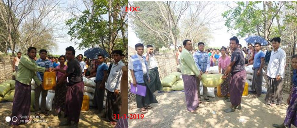 ဘူးသီးတောင်မြို့နယ်၊ ကျွဲရိုင်းခတ်ကျေးရွာအုပ်စု၊ စက်ခေါ်ကျေးရွာရှိ တိုက်ပွဲရှောင်ပြည်သူ(၂၅၇)ဦးအား စားရိက္ခာ (၁၄)ရက်စာ၊ ဆန် (၃၇)အိတ် (၁၁)ပြည်( ၄)ဘူး၊ ဆီ( ၄၄.၉၇၅)ပိသာ၊ ဆား (၈.၉၉၅)ပိသာ၊ ပဲ (၁၇၉.၉)ပိသာ တို့အား လူမှုဝန်ထမ်း၊ ကယ်ဆယ်ရေးနှင့်ပြန်လည်နေရာချထားရေးဝန်ကြီးဌာန၊ ဘေးအန္တရာယ်ဆိုင်ရာစီမံခန့်ခွဲမှုဦးစီးဌာန၊ မောင်တောခရိုင်ဦးစီးမှူးဦးမောင်မောင်ကြီး၊ ဘူးသီးတောင်မြို့နယ် အထွေထွေအုပ်ချုပ်ရေးဦးစီးဌာနမှ ဒုတိယဦးစီးမှူး ဦးနေဟိန်းကျော်တို့နှင့်အတူ ဘူးသီးတောင်မြို့နယ်ဦးစီးမှူးရုံးမှ တာဝန်ရှိ သူများသည် (၃၁-၃-၂၀၁၉)ရက်နေ့တွင် ပြည်သူများ၏လက်ဝယ်အရောက် ထောက်ပံ့ပေးအပ်ခဲ့ကြောင်း သိရှိ ရပါသည်။