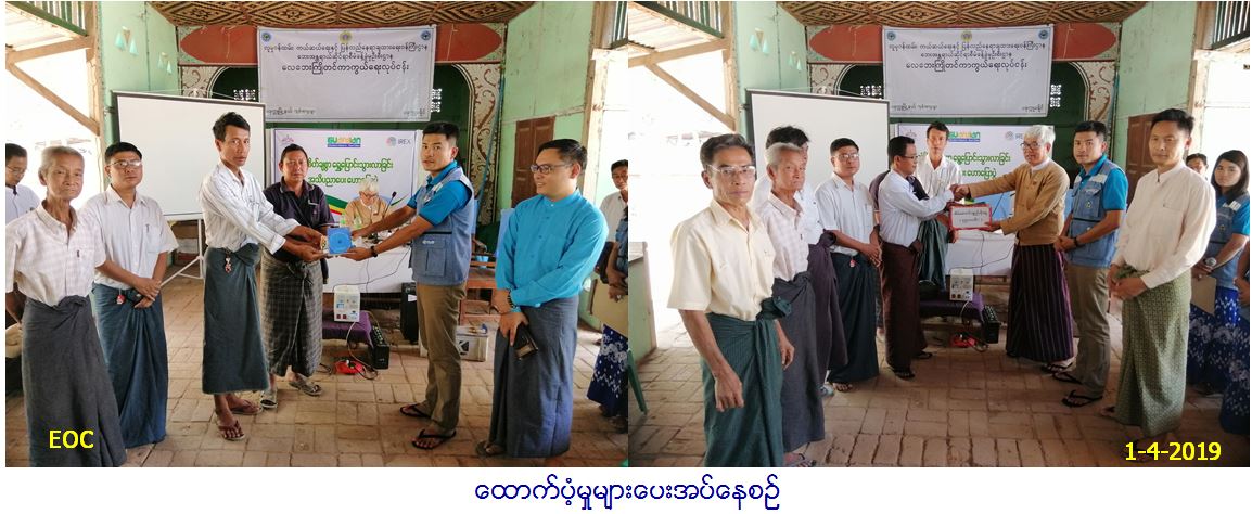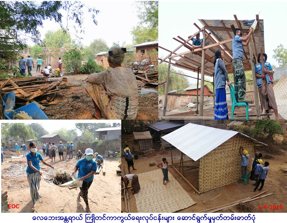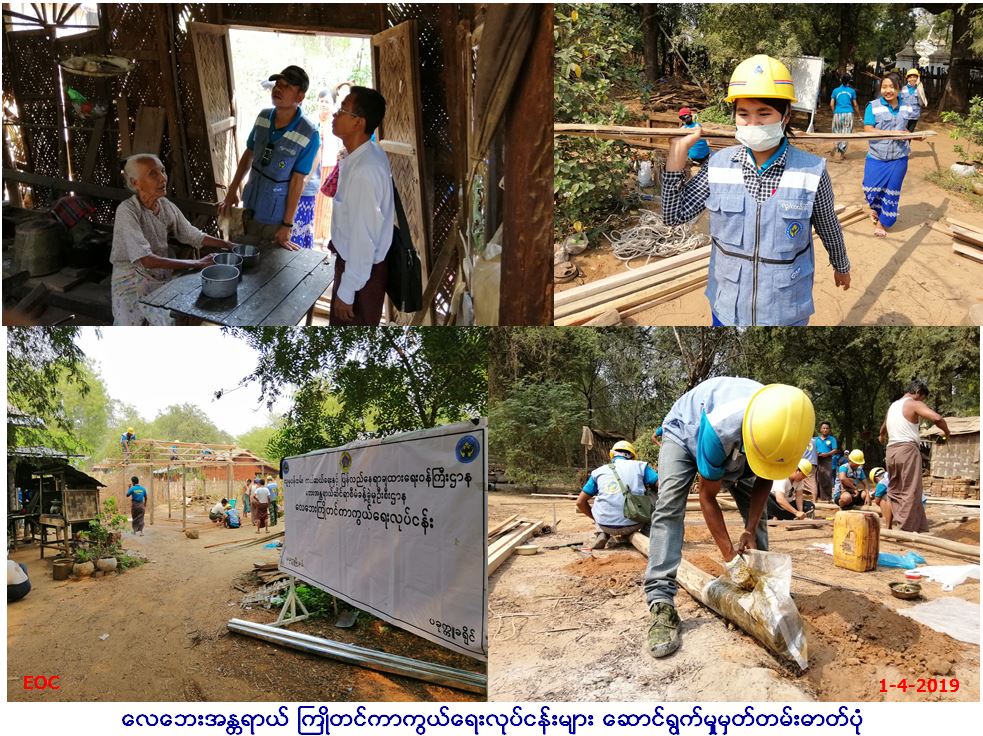 လူမှုဝန်ထမ်း၊ ကယ်ဆယ်ရေးနှင့်ပြန်လည်နေရာချထားရေးဝန်ကြီးဌာန၊ ဘေးအန္တရာယ်ဆိုင်ရာစီမံခန့်ခွဲမှုဦးစီး ဌာန၊ ပခုက္ကူခရိုင်ဦးစီး မှူးရုံးမှ တာဝန်ရှိသူများသည် (၃၀∕၃၁-၃-၂၀၁၉)ရက်နေ့များတွင် နွေဦးရာသီအတွင်း နှစ်စဉ်လေပြင်းဘေးအန္တရာယ်ကြုံတွေ့ရသော ပခုက္ကူခရိုင်၊ ပခုက္ကူမြို့နယ်အတွင်းရှိ ကျေးရွာများ၌ သဘာဝဘေးအန္တရာယ် များကြောင့် ဒေသခံပြည်သူများ၏ အသက်အိုး အိမ်စည်းစိမ်ပစ္စည်းများ ဆုံးရှုံးမှုလျှော့နည်းရန်အတွက် လေဘေးကြိုတင်ကာကွယ်ရေးလုပ်ငန်း အသိပညာပေးလုပ်ငန်းများအပြင် လေဘေး ကြိုတင်ကာကွယ်ရေးလုပ်ငန်းစီမံချက်ကိုလည်း လက်တွေ့စီမံခန့်ခွဲဆောင်ရွက်လျက်ရှိပါသည်၊၊ လုပ်ငန်း ဆောင်ရွက်ရာတွင် ပြည်သူ့လွှတ်တော်ကိုယ်စားလှယ် ဦးပိုက်ကို၊ Dry Zone Network မှ CBO ဦးရဲထွဋ်၊ Guardian Network မှ စီမံကိန်းမန်နေဂျာ ဦးလင်းသူအောင်၊ Pakokku CSOs Platform၊ ပုညမုဒိတာ ကျန်းမာရေးကူညီထောက်ပံ့မှုနှင့် သွေးလှူအသင်း၊ မိတ်ဖက် အဖွဲ့အစည်းများ၊ ကွန်းရွာကျေးရွာအုပ်စု အုပ်ချုပ်ရေးမှူး ဦးမျိုးထွန်းနှင့်အတူ ဒေသခံပြည်သူများလည်း ဝိုင်းဝန်းပူးပေါင်း၍ လေဘေး ကြိုတင်ကာကွယ်ရေးလုပ်ငန်းအား မိတ်ဆက်ရှင်းလင်း၍ သဘာဝဘေးအန္တရာယ် အသိပညာပေးဟောပြောပွဲအား ကျင်းပပြုလုပ်ခဲ့ပြီး လေဘေးအန္တရာယ်မှ ကြိုတင်ကာကွယ်ရေးလုပ်ငန်းများဆောင်ရွက်ရန်အတွက် အိမ်ဆောက်ပစ္စည်းဖိုး (၄၅၀၀၀၀∕-)(ကျပ်လေး သိန်းငါးသောင်း)၊ သဘာဝဘေးအန္တရာယ်အသိပညာပေး ဗွီဒီယိုဇာတ်လမ်းများနှင့် အသိပညာပေးလက်ကမ်းစာစောင်များအား ဒေသခံ ပြည်သူများ၏ လက်ဝယ်အရောက် ထောက်ပံ့ပေးအပ်ခဲ့ပါသည်၊၊