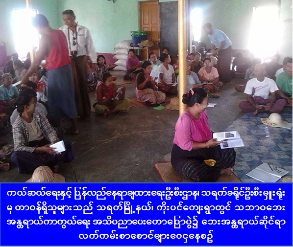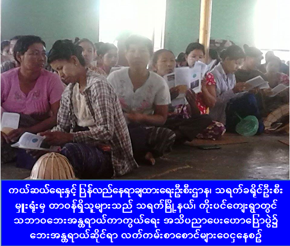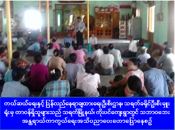(၂၇.၄.၂၀၁၆ ) ရက်နေ့ တွင် ကယ်ဆယ်ရေးနှင့်ပြန်လည်နေရာချထားရေးဦးစီးဌာန၊သရက်ခရိုင်ဦးစီးမှူးရုံးမှ တာဝန်ရှိသူများသည်သရက်မြို့နယ်၊ကိုးပင်ကျေးရွာတွင် သဘာဝဘေးအန္တရာယ်ကာကွယ်ရေးအသိပညာပေးဟောပြောပွဲကျင်းပပြုလုပ်၍ လက်ကမ်းစာစောင်များ ဖြန့်ဝေခဲ့ရာလူဦးရေ (၁၁၀) တက်ရောက်ခဲ့ကြောင်းသိရှိရပါသည်။