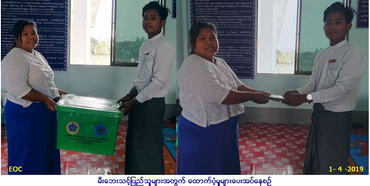 လူမှုဝန်ထမ်း၊ ကယ်ဆယ်ရေးနှင့် ပြန်လည်နေရာချထားရေးဝန်ကြီးဌာန၊ ဘေးအန္တရာယ်ဆိုင်ရာစီမံခန့်ခွဲမှုဦးစီးဌာန၊ ယင်းမာပင်ခရိုင် ဦးစီးမှူးရုံးမှ တာဝန်ရှိသူများသည် ယင်းမာပင်ခရိုင်၊ ဆားလင်းကြီးမြို့နယ်၊ ထန်းဇင်ကျေးရွာအုပ်စု၊ ခံကုန်းကျေးရွာ၌ (၃၁.၃.၂၀၁၉) ရက်နေ့ဖြစ်ပွားသောမီးဘေးမှ အိမ်ထောင်စု(၁)စု၊ လူဦးရေ(၅)ဦးအတွက် ကယ်ဆယ်ရေးပစ္စည်း(၁၆)မျိုးအိမ်ထောင်စု (၁)စုစာနှင့်ဆန်ရိက္ခာနှင့် အိမ်ဆောက်ပစ္စည်းဖိုးထောက်ပံ့ငွေ (၁၁၀၅၀၀/-)ကျပ်တို့အား (၁.၄.၂၀၁၉)ရက်နေ့တွင် ဆားလင်ကြီးမြို့နယ်အထွေထွေအုပ်ချုပ်ရေးဦးစီးဌာနသို့ လွှဲပြောင်းထောက်ပံ့ပေး အပ်ခဲ့ကြောင်း သတင်းရရှိပါသည်။