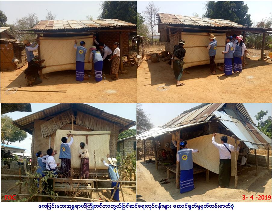 လူမှုဝန်ထမ်း၊ ကယ်ဆယ်ရေးနှင့်ပြန် လည်နေရာချထားရေးဝန်ကြီးဌာန၊ ဘေးအန္တရာယ်ဆိုင်ရာစီမံခန့်ခွဲမှုဦးစီးဌာန၊ ရှမ်းပြည်နယ် ဦးစီးမှူးရုံးမှ တာဝန်ရှိသူများသည် မိုးကြိုကာလဖြစ်သော ဧပြီ၊ မေ ကာလများတွင် လေပြင်းများကျရောက်နိုင်သဖြင့် (၃-၄-၂၀၁၉) ရက်နေ့၌ ပင်းတယမြို့နယ်၊ မိုင်းအင်ကျေးရွာ တွင် လေပြင်းဘေးလက်ကမ်း စာစောင်များဖြန့်ဝေပေးခြင်းနှင့် လေဘေးအန္တရာယ် ကြိုတင်ကာကွယ် ပြင်ဆင်ရေးလုပ်ငန်းများဖြစ်သော လေဘေးဒဏ်ခံနိုင်ရည်ရှိသည့် လူနေအိမ်များဖြစ်စေရေးအတွက် ရပ်ကွက် ကျေးရွာအုပ်ချုပ်ရေးမှူးများ၊ ရပ်ကွက်ကျေးရွာစာရေးများ၊ ကျေးရွာပြည်သူများနှင့်အတူ ပူးပေါင်းဆောင်ရွက်ခဲ့ကြောင်း သတင်းရရှိ ပါသည်။