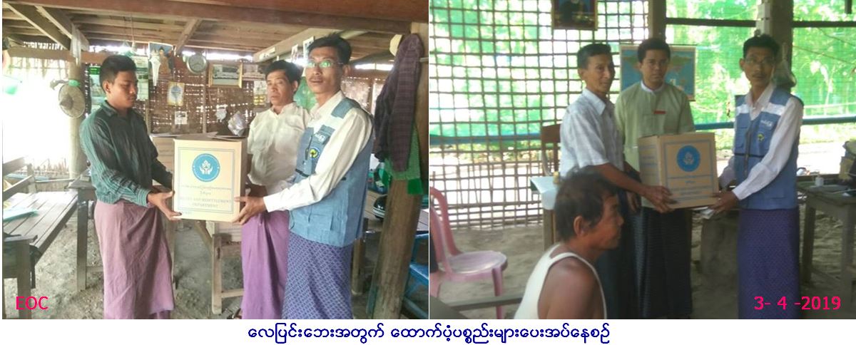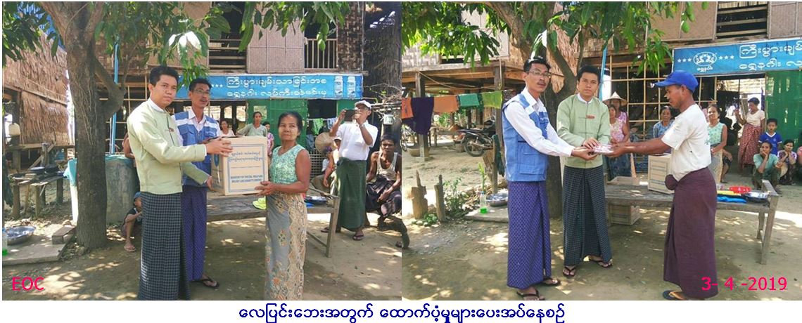 လူမှုဝန်ထမ်း၊ ကယ်ဆယ်ရေးနှင့်ပြန်လည်နေရာ ချထားရေးဝန်ကြီးဌာန၊ ဘေးအန္တရာယ်ဆိုင်ရာ စီမံခန့်ခွဲမှုဦးစီးဌာန၊ သရက်ခရိုင်ဦးစီးမှူး ရုံးမှ တာဝန်ရှိသူများသည်ကံမမြို့နယ်၊ (ကျွန်းကလေး၊ ထောက်ရှာခုံ၊ ထန်းလေးပင်၊ ဝန်လိုကိုင်း) ကျေးရွာတို့တွင် (၂.၄.၂၀၁၉) ရက်နေ့၊ (၁ရး၀၀)နာရီမှ (၁ရး၃၀)နာရီ အချိန်အထိ လေပြင်းတိုက်ခတ်မှုကြောင့် နေအိမ်(၁၇)လုံးအမိုးလန်ခဲ့ပြီး အိမ်ထောင်စု (၁၇)စု၊ လူဦးရေ စုစုပေါင်း (၆၂)ဦး ဘေးသင့်ခဲ့ရာ ဘေးသင့်လူဦးရေ (၆၂)ဦးအတွက် ဆန်ရိက္ခာဖိုး(၇)ရက်စာ (၁၃၀,၂၀၀/-)ကျပ်နှင့် နေအိမ် (၁၇)လုံးအတွက် အိမ်ဆောက်ပစ္စည်းဖိုး (၅၁၀,၀၀၀/-)ကျပ်၊ ရန်ပုံငွေစုစုပေါင်း (၆၄၀,၂၀၀/-)ကျပ်နှင့် ကယ်ဆယ်ရေးပစ္စည်း(၉)မျိုး (၁၇)အိမ်ထာင်စာတို့အား (၃.၄.၂၀၁၉) ရက်နေ့တွင် ကံမမြို့နယ်အထွေထွေ အုပ်ချုပ်ရေးဦးစီးဌာနမှ တာဝန်ရှိသူများနှင့်အတူ ကျေးရွာ အုပ်ချုပ်ရေးမှူး၏ရှေ့မှောက်တွင် ဘေးသင့်ပြည်သူများလက်ဝယ်သို့ သွားရောက်ထောက်ပံ့ပေးအပ်ခဲ့ပါကြောင်း သတင်းရရှိပါသည်။