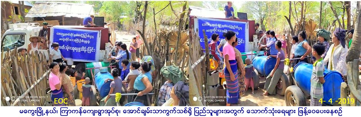 လူမှုဝန်ထမ်း၊ ကယ်ဆယ်ရေးနှင့် ပြန်လည်နေရာချထားရေးဝန်ကြီးဌာန၊ ဘေးအန္တရာယ်ဆိုင်ရာစီမံခန့်ခွဲမှုဦးစီးဌာန၊ မကွေးတိုင်းဒေသကြီးဦးစီးမှူးရုံးမှ တာဝန်ရှိသူများသည် သောက်သုံးရေ ရှားပါးလျက်ရှိသော မကွေးမြို့နယ်၊ ကြာကန်ကျေးရွာအုပ်စု၊ အောင်ချမ်း သာကွက်သစ်ရှိ အိမ်ခြေ(၁၀၀)၊ အိမ်ထောင်စု (၁၁၀)စု၊ လူဦးရေ (၅၀၀)ဦးတို့အတွက် သောက်သုံးရေဂါလံ (၆၀၀၀)အား (၃.၄.၂၀၁၉) ရက်နေ့ (၀၉း၀၀)နာရီအချိန်တွင် သွားရောက်ဖြန့်ဝေပေးခဲ့ပါကြောင်း သတင်းရရှိပါသည်။
