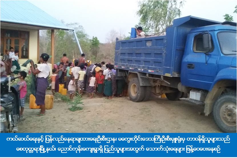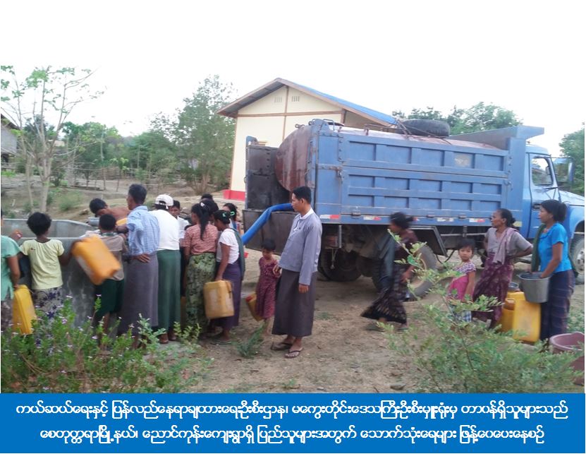 ကယ်ဆယ်ရေးနှင့် ပြန်လည်နေရာချထားရေးဦးစီးဌာန၊ မကွေးတိုင်းဒေသကြီးဦးစီးမှူးရုံးမှ တာဝန်ရှိသူများသည် (၂၈-၄-၂၀၁၆) ရက်နေ့တွင် စေတုတ္တရာမြို့နယ်၊ ညောင်ကုန်းကျေးရွာရှိ အိမ်ခြေ (၁၅၂) မှ လူဦးရေ (၆၄၅) အတွက် သောက်သုံးရေဂါလံ (၁၆၀၀) ကို သွားရောက်ဖြန့်ဝေပေးခဲ့ကြောင်း သိရှိရပါသည်။