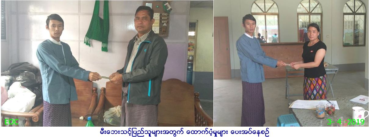 လူမှုဝန်ထမ်း၊ ကယ်ဆယ်ရေးနှင့် ပြန်လည်နေရာချထားရေးဝန်ကြီးဌာန၊ ဘေးအန္တရာယ်ဆိုင်ရာစီမံခန့်ခွဲမှုဦးစီးဌာန၊ မူဆယ်မြို့နယ် ဦးစီးမှူးရုံးမှ တာဝန်ရှိသူများသည် မူဆယ်မြို့၊ ခရစ်ယာန်ရပ်ကွက်၊ နယ်မြေ(၅)၌ (၃၀-၃-၂၀၁၉) ရက်နေ့၊ (၁၅:၃၀)နာရီ အချိန်တွင် ဖြစ်ပွားခဲ့သော မီးဘေးကြောင့် ဘေးသင့်အိမ်ခြေ (၁) လုံး၊ အိမ်ထောင်စု (၂)စုအတွက် ထောက်ပံ့ငွေ (၂၀၀,၀၀၀/-) ကျပ်နှင့် လူဦးရေ (၁၇)ဦးအတွက် တစ်ပတ်စာ ဆန်ဖိုးထောက်ပံ့ငွေ (၃၅,၇၀၀/-) ကျပ်၊ စုစုပေါင်းထောက်ပံ့ငွေ(၂၃၅,၇၀၀)ကျပ်အား (၃-၄-၂၀၁၉) ရက်နေ့တွင် ဘေးသင့်ပြည်သူ များလက်ဝယ်သို့ ထောက်ပံ့ပေးအပ်ခဲ့ကြောင်း သတင်းရရှိပါသည်။