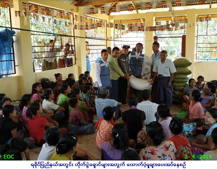 တိုက်ပွဲများဖြစ်ပွားမှုကြောင့် ရခိုင်ပြည်နယ်၊ မြို့နယ်(၆)မြို့နယ်ရှိ ယာယီခိုလှုံရာစခန်း (၁၀၂)ခု၌ (၈-၁၂-၂၀၁၈)နေ့မှ (၂-၄-၂၀၁၉)နေ့အတွင်း တိုက်ပွဲရှောင်အိမ်ထောင်စု ခြောက်ထောင်ကျော်၊ လူဦးရေနှစ်သောင်းခြောက်ထောင်ကျော် ရောက်ရှိခိုလှုံခဲ့ပါသည်။ တိုက်ပွဲရှောင်များ ရောက်ရှိနေထိုင်ကြောင်း သတင်းရရှိလျှင် ရရှိချင်း လူမှုဝန်ထမ်း၊ ကယ်ဆယ် ရေးနှင့် ပြန်လည်နေရာချထားရေး ဝန်ကြီးဌာန၏ ပေါင်းစပ်ညှိနှိုင်းမှုဖြင့် ဘေးအန္တရာယ်ဆိုင်ရာ စီမံခန့်ခွဲမှုဦးစီးဌာန၊ ရခိုင်ပြည်နယ်ဦးစီးမှူးရုံး သည် ရခိုင်ပြည်နယ်အစိုးရအဖွဲ့၊ ခရိုင်/မြို့နယ် အထွေထွေအုပ်ချုပ်ရေးဦးစီးဌာနများမှ တာဝန်ရှိသူများနှင့်အတူပူးပေါင်း၍ ဘေးသင့်သူများ လက်ဝယ်သို့ဖြစ်စေ၊ အနီးဆုံးစုရပ်သို့ဖြစ်စေ၊ ယာယီခိုလှုံရာစခန်းများ မှတဆင့်ဖြစ်စေ ထောက်ပံ့ကူညီမှုများ ဆောင်ရွက်ခဲ့ပါသည်။ ရခိုင်ပြည်နယ် ဝန်ကြီးချုပ်မှ ကွင်းဆင်းထောက်ပံ့မှုအပြင် ပြည်ထောင်စုအဆင့်မှ ကွင်းဆင်းဆောင်ရွက်မှု များအနေဖြင့် လူမှုဝန်ထမ်း၊ ကယ်ဆယ်ရေးနှင့် ပြန်လည်နေရာချထားရေးဝန်ကြီးဌာန ပြည်ထောင်စုဝန်ကြီး ဒေါက်တာ ဝင်းမြတ်အေးနှင့် ဒုတိယဝန်ကြီး၊ နိုင်ငံတော်အတိုင်ပင်ခံရုံးဝန်ကြီးဌာန ဒုတိယဝန်ကြီး ဦးဆောင်သောအဖွဲ့များ၊ ဘေးအန္တရာယ်ဆိုင်ရာစီမံခန့်ခွဲမှုဦးစီးဌာန၊ ညွှန်ကြားရေးမှူးချုပ် ဦးဆောင်သော အဖွဲ့များသည် ၂၀၁၉ ခုနှစ်၊ ဇန်နဝါရီလ၊ ဖေဖော်ဝါရီလနှင့် မတ်လများအတွင်း၌ တိုက်ပွဲရှောင်များထံ ကွင်းဆင်းတွေ့ဆုံ၍ ဆန်ရိက္ခာဖိုး၊ ကယ်ဆယ်ရေးပစ္စည်း များဖြစ်သည့် စောင်၊ ပလပ်စတစ်ဖျာနှင့် သေဆုံး/ဒဏ်ရာရထောက်ပံ့ကြေးငွေများ ပံ့ပိုးလျက်ရှိရာ (၂-၄-၂၀၁၉)နေ့အထိ ကျပ်သိန်းပေါင်း (၄၀၀၀)ခန့်တန်ဖိုးရှိ စားနပ်ရိက္ခာ၊ ကယ်ဆယ်ရေးပစ္စည်းနှင့် ထောက်ပံ့ကြေးငွေများ ပံ့ပို့ခဲ့ပြီး ဖြစ်ပါသည်။ ထို့အပြင် အဆိုပါမြို့နယ်များအတွင်း နေထိုင်သူများမှ စားနပ် ရိက္ခာအခက်အခဲ ရှိကြောင်း သတင်းပို့လာပါက ထောက်ပံ့ပေးနိုင်ရေးအတွက်လည်း စီစဉ်ထားရှိပြီးဖြစ်ပါသည်။