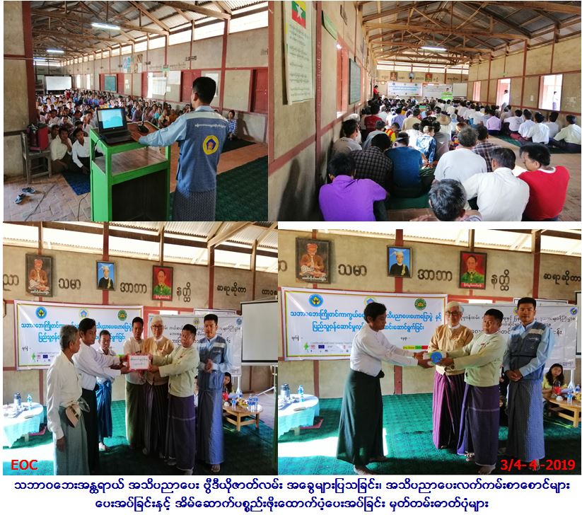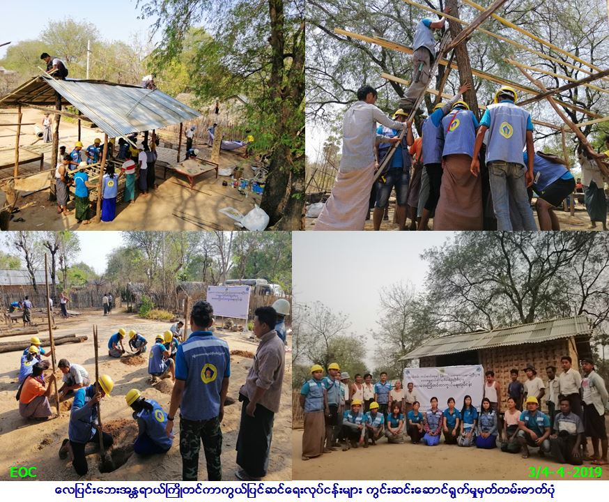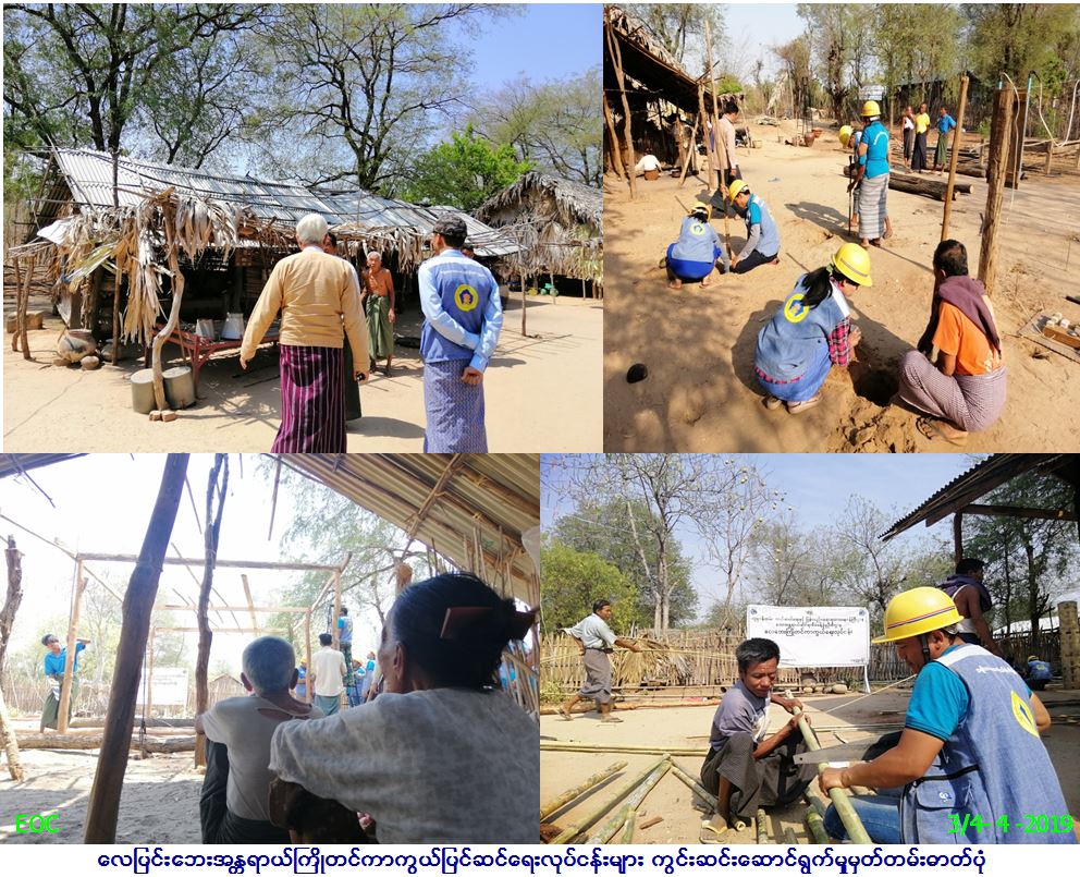 လူမှုဝန်ထမ်း၊ ကယ်ဆယ်ရေးနှင့် ပြန်လည်နေရာချထားရေးဝန်ကြီးဌာန၊ ဘေးအန္တရာယ်ဆိုင်ရာစီမံခန့်ခွဲမှုဦးစီးဌာန၊ ပခုက္ကူခရိုင် ဦးစီးမှူးရုံးမှ တာဝန်ရှိသူများသည် (၃∕၄-၄-၂၀၁၉)ရက်နေ့များတွင် နွေဦးရာသီ အတွင်း နှစ်စဉ်လေပြင်းဘေးအန္တရာယ်ကြုံတွေ့ ရသော ပခုက္ကူခရိုင်၊ ပခုက္ကူမြို့နယ်အတွင်းရှိ ကျေးရွာများ၌ သဘာဝဘေးအန္တရာယ် များကြောင့် ဒေသခံပြည်သူများ၏ အသက် အိုးအိမ်စည်းစိမ်ပစ္စည်းများ ဆုံးရှုံးမှု လျှော့နည်းရန်အတွက် လေဘေးကြိုတင် ကာကွယ်ရေးလုပ်ငန်းအသိပညာပေးလုပ်ငန်းများအပြင် လေဘေးကြိုတင်ကာကွယ်ရေး လုပ်ငန်းစီမံချက်ကိုလည်း လက်တွေ့စီမံ ခန့်ခွဲဆောင်ရွက်လျက်ရှိပါသည်၊၊ လုပ်ငန်းဆောင်ရွက်ရာတွင် ပြည်သူ့လွှတ်တော် ကိုယ်စားလှယ် ဦးပိုက်ကို၊ မြို့နယ်သဘာဝဘေးဘေးအန္တရာယ်ဆိုင်ရာ စီမံခန့်ခွဲမှုကော်မတီ ဥက္ကဌ ဦးမြင့်ဆောင်၊ မြို့နယ်အဆင့်ဌာနဆိုင်ရာများ၏ ဒေသဖွံ့ဖြိုးရေးနှင့် ပြည်သူ့ဝန်ဆောင်မှု လုပ်ငန်း(OSS)၊ Dry Zone Network မှ CBO ဦးရဲထွဋ်၊ KYDO မှ PC ဦးဇော်နိုင်ထွန်း၊ Pakokku CSOs Platform၊ မိတ်ဖက်အဖွဲ့အစည်းများ၊ ဖောင်းကွဲကျေးရွာ အုပ်စုအုပ်ချုပ်ရေးမှူး ဦးမော်ဌေးနှင့်အတူ ဒေသခံပြည်သူများလည်း ဝိုင်းဝန်းပူးပေါင်း၍ လေဘေးကြိုတင်ကာကွယ်ရေးလုပ်ငန်းအား မိတ်ဆက်ရှင်းလင်း ခြင်းနှင့် သဘာဝဘေးအန္တရာယ်အသိပညာပေးဟောပြောပွဲအား ကျင်းပပြုလုပ်ခဲ့ပြီး လေဘေးအန္တရာယ်ကြိုတင်ကာကွယ်ရေး လုပ်ငန်း များဆောင်ရွက်ရန်အတွက် အိမ်ခြေ(၃၀)အတွက် အိမ်ဆောက်ပစ္စည်းဖိုး (၄၅၀၀၀၀∕-) (ကျပ်လေးသိန်းငါးသောင်းတိတိ)၊ သဘာ၀ ဘေးအန္တရာယ် အသိပညာပေး ဗွီဒီယိုဇာတ်လမ်း အခွေများနှင့် အသိပညာပေးလက်ကမ်းစာစောင်များအား ဒေသခံပြည်သူများ၏ လက်ဝယ်အရောက် ထောက်ပံ့ပေးအပ်ခဲ့ပါသည်၊၊