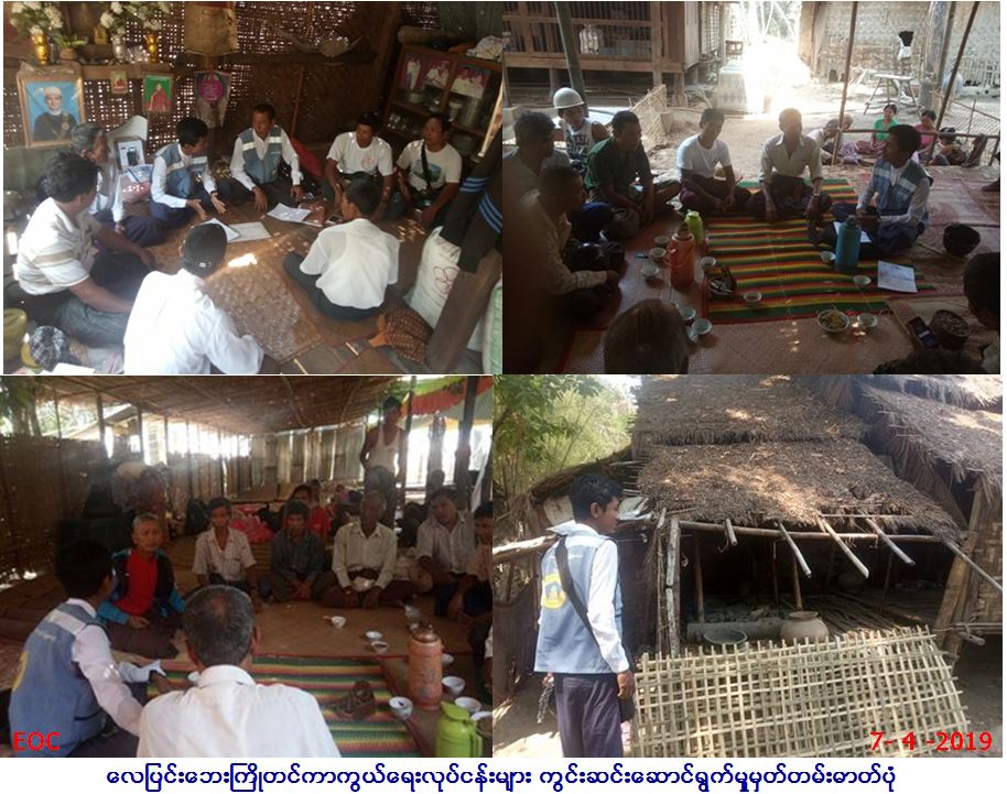 လူမှုဝန်ထမ်း၊ ကယ်ဆယ်ရေးနှင့်ပြန်လည်နေရာ ချထားရေးဝန်ကြီးဌာန၊ ဘေးအန္တရာယ်ဆိုင်ရာ စီမံခန့့်ခွဲမှုဦးစီးဌာန၊ ဟင်္သာတခရိုင်ဦးစီး မှူးရုံးမှ တာဝန်ရှိသူများသည် အင်္ဂပူမြို့နယ်၊ ရွာသာယာအုပ်စု၊ ချောင်းခွအုပ်စုတို့မှ လေပြင်းဒဏ်ခံနိုင်ရည်အားနည်းသည့်နေအိမ်၊ အဘိုးအဘွားများနေအိမ်၊ ဆင်းရဲနွမ်းပါးပြီး မိသားစုဝင်များပြားသည့် နေအိမ် (၃၀)လုံးအား ရွေးချယ်ပြီး နေအိမ်များမွမ်းမံပြင်ဆင် မှုဆောင်ရွက်နိုင်ရန်အတွက် (၇.၄.၂၀၁၉)ရက်နေ့တွင် ကျေးရွာအုပ်စုတစ်ခု ချင်းအလိုက် ကျေးရွာအုပ်ချုပ်ရေးမှူး၊ ကျေးရွာစာရေး၊ စေတနာ့ဝန်ထမ်းလူငယ်များ၊ ကျေးရွာပြည်သူလူထုများနှင့်တွေ့ဆုံ၍ လေပြင်းဘေးကြိုတင်ပြင်ဆင်ရေးအတွက် နေအိမ်များ မွမ်းမံပြင်ဆင်မည့် အစီအစဉ်များအား အသေးစိတ်ဆွေးနွေး ညှိနှိုင်းခြင်း၊ နေအိမ်များအား ကျေးရွာမှ တာဝန်ရှိသူများနှင့်အတူ ကွင်းဆင်း စစ်ဆေးခြင်းများ ဆောင်ရွက် ခဲ့ပါကြောင်း သတင်းရရှိပါသည်။