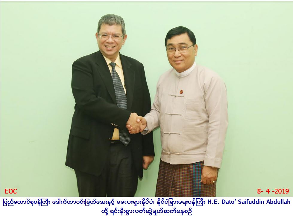 လူမှုဝန်ထမ်း၊ ကယ်ဆယ်ရေးနှင့်ပြန် လည်နေရာ ချထားရေးဝန်ကြီးဌာန ပြည်ထောင်စုဝန်ကြီး ဒေါက်တာဝင်းမြတ်အေး အား မလေးရှားနိုင်ငံ၊ နိုင်ငံခြားရေးဝန်ကြီး H.E. Dato’ Saifuddin Abdullah ဦးဆောင်သည့် အဖွဲ့က ယနေ့နံနက်ပိုင်းတွင် အဆိုပါဝန်ကြီးရုံး အစည်းအဝေးခန်းမ၌ လာရောက် တွေ့ဆုံပါသည်။