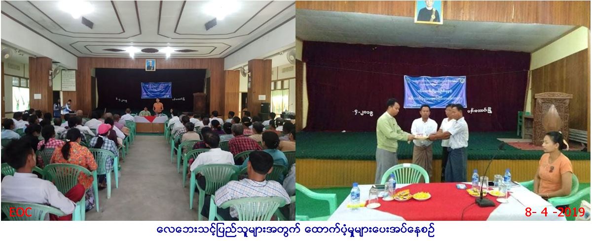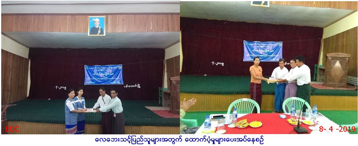 လူမှုဝန်ထမ်း၊ ကယ်ဆယ်ရေးနှင့်ပြန်လည်နေရာ ချထားရေးဝန်ကြီးဌာန၊ ဘေးအန္တရာယ်ဆိုင်ရာ စီမံခန့်ခွဲမှုဦးစီးဌာန၊ ပြည်ခရိုင်ဦးစီးမှူး ရုံးနှင့် ပန်းတောင်းမြို့နယ်ဦးစီးမှူးရုံးမှ တာဝန်ရှိသူများသည် ပန်တောင်းမြို့နယ် ရပ်ကွက် (၃)ခုနှင့် ကျေးရွာအုပ်စု (၇)စုတွင် (၂.၄.၂၀၁၉)ရက်နေ့ ညနေ(၁၆း၃၀)နာရီအချိန် မိုးရွာသွန်းပြီး လေပြင်းတိုက်ခတ်မှုကြောင့် လေဘေးသင့်ခဲ့သည့် အမိုးလန်နှင့် တစိတ်တပိုင်းပျက်စီးလူနေအိမ်ခြေ (၁၃၀)လုံးနှင့် ဘာသာရေးအဆောက်အဦ (၂)ခု စုစုပေါင်း (၁၃၂)လုံးအတွက် အိမ်ဆောက် ပစ္စည်းဖိုးထောက်ပံ့ငွေ (၂,၆၃၈,၀၀၀/-) ကျပ်အား (၈.၄.၂၀၁၉)ရက်နေ့ နေ့လည် (၁၃း၀၀) အချိန် ပန်းတောင်းမြို့ တိုင်းဒေသကြီး လွှတ်တော်ကိုယ်စားလှယ် မြို့နယ်ဒုတိယ အုပ်ချုပ်ရေးမှူးနှင့် ရပ်ကျေးအုပ်ချုပ်ရေးမှူး များနှင့်အတူ ပြည်သူများ လက်ဝယ်အရောက် ထောက်ပံ့ပေးအပ်ခဲ့ကြောင်း သတင်းရရှိပါ သည်။