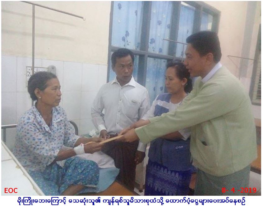 လူမှုဝန်ထမ်း၊ ကယ်ဆယ်ရေးနှင့်ပြန်လည်နေရာ ချထားရေးဝန်ကြီးဌာန၊ ဘေးအန္တရာယ်ဆိုင်ရာ စီမံခန့်ခွဲမှုဦးစီးဌာန၊ ဂန့်ဂေါခရိုင်ဦးစီး မှူးရုံးမှ တာဝန်ရှိသူများသည် ဂန့်ဂေါခရိုင်၊ ဂန့်ဂေါမြို့နယ်၊ ဇာဟောကျေးရွာအုပ်စု၊ ဇာဟောကျေးရွာတွင် (၈-၄-၂၀၁၉)ရက်နေ့ (၁၅း၃၀)နာရီအချိန်၌ မိုးသည်းထန်စွာရွာ သွင်းမှုကြောင့် မိုးကြိုးထိမှန်သေဆုံး သူ(၁)ဦးအတွက် ထောက်ပံ့ငွေ(၃၀၀၀၀၀/-) ကိုဂန့်ဂေါ မြို့နယ်အထွေထွေအုပ်ချုပ်ရး ဦးစီးဌာနမှ ဒုတိယမြို့နယ် အုပ်ချုပ်ရေးမှူး၊ ဇာဟောကျေးရွာအုပ်စုအုပ်ချုပ်ရေးမှူးများနှင့် အတူ (၈-၄-၂၀၁၉)ရက်နေ့ (၂၀း၄၅) နာရီအချိန်တွင် သေဆုံးသူ၏ ကျန်ရစ်သူမိသားစု လက်ဝယ်အရောက် ထောက်ပံ့ပေးအပ်ခဲ့ကြောင်း သတင်း ရရှိပါသည်။