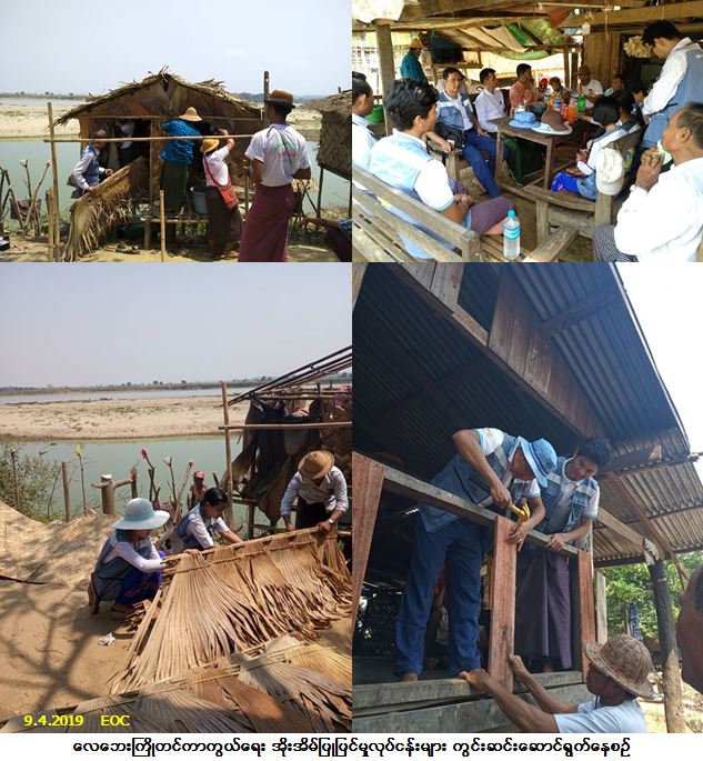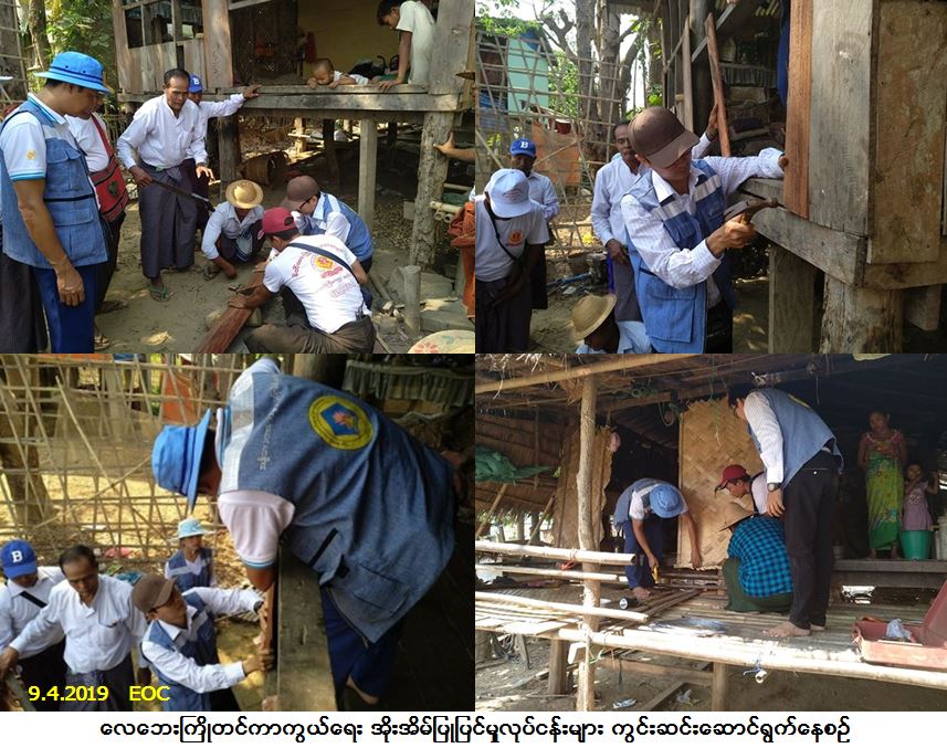 လူမှုဝန်ထမ်း၊ ကယ်ဆယ်ရေးနှင့် ပြန်လည်နေရာချထားရေးဝန်ကြီးဌာန၊ ဘေးအန္တရာယ်ဆိုင်ရာ စီမံခန့်ခွဲမှုဦးစီးဌာန၊ ပဲခူးတိုင်းဒေသကြီးဦးစီးမှူးရုံးမှတာဝန်ရှိသူများသည် ညောင်လေးပင်မြို့နယ် တိုင်းဒေသကြီးလွှတ်တော်ကိုယ်စား လှယ်၊ မဒေါက်မြို့အုပ်ချုပ်ရေးမှူး၊ သောင်ကြီးကျေးရွာအုပ်စုအုပ်ချုပ်ရေးမှူးနှင့် မေတ္တာဖြူစင်စေတနာရှင် ပရဟိတအသင်းအဖွဲ့ဝင်များနှင့်ပူးပေါင်း၍ (၉-၄-၂၀၁၉) ရက်နေ့တွင် ပဲခူးတိုင်းဒေသကြီး၊ ပဲခူးခရိုင်၊ ညောင်လေးပင်မြို့နယ်၊ မဒေါက်မြို့၊ သောင်ကြီးကျေးရွာအုပ်စု၊ ဗောဓိကုန်ရွာ၊ ကန့်လန့်စုရွာ၊ သောင်ကြီးကျေးရွာများသို့ သွားရောက်၍ လေဘေးကြိုတင်ကာကွယ်ရေး အိုးအိမ်ပြုပြင်မှုလုပ်ငန်းများကို ကွင်းဆင်းဆောင်ရွက်ခဲ့ပါကြောင်း သတင်းရရှိပါသည်။