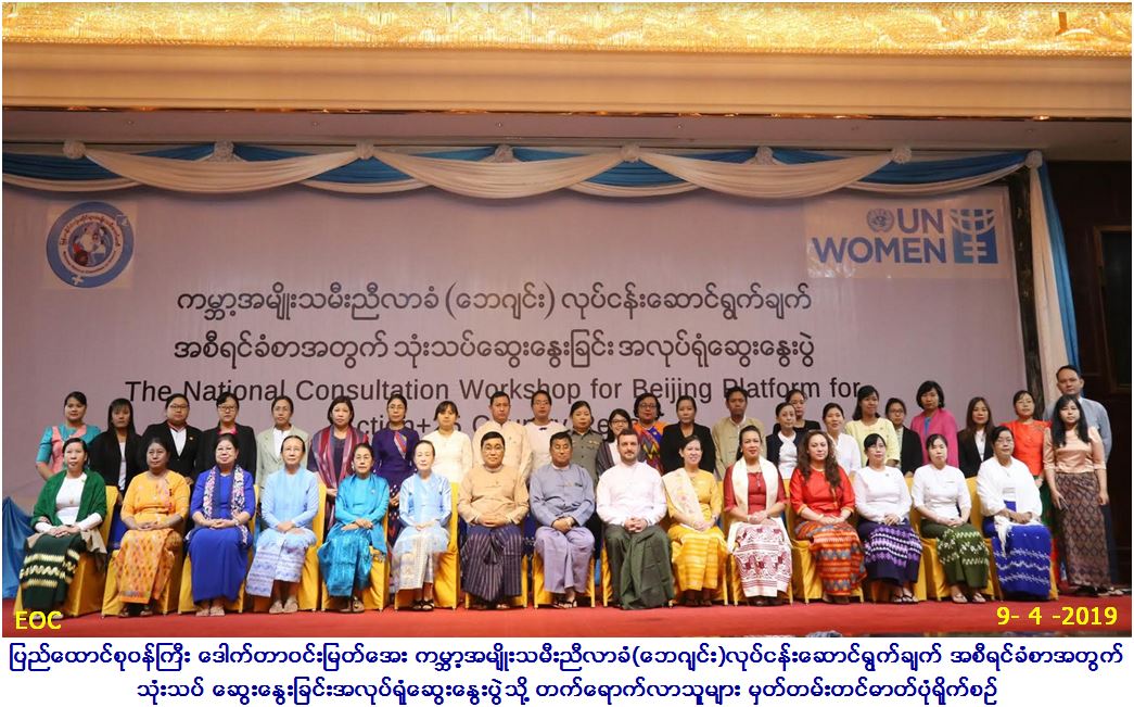 ပြည်ထောင်စုဝန်ကြီးက မြန်မာနိုင်ငံအနေဖြင့် ၁၉၉၅ ခုနှစ်တွင် တရုတ်နိုင်ငံ၊ ဘေဂျင်းမြို့၌ ကျင်းပသော စတုတ္ထအကြိမ် အမျိုးသမီးရေးရာ ကမ္ဘာ့ညီလာခံကို တက်ရောက်ခဲ့ပြီး အမျိုးသမီးများ ဖွံ့ဖြိုးတိုးတက်ရေးကို တက်ကြွစွာ ဆောင်ရွက်နိုင်ရန်အတွက် မြန်မာနိုင်ငံလုံးဆိုင်ရာ အမျိုးသမီးကော်မတီ (Myanmar National Committee on Women-MNCW) ကို ၁၉၉၆ခုနှစ်တွင် စတင်ဖွဲ့စည်းခဲ့ပါကြောင်း၊ အဆိုပါ ကော်မတီကို နိုင်ငံတော်၏မူဝါဒများနှင့်အညီ ၂၀၁၈ ခုနှစ် ဇွန်လ ၂၀ ရက်နေ့တွင် ဌာနဆိုင်ရာများ၊ အရပ်ဘက်လူမှုရေးအဖွဲ့အစည်းများဖြင့် မြန်မာနိုင်ငံလုံးဆိုင်ရာ အမျိုးသမီးကော်မတီကို ပြန်လည်ဖွဲ့စည်းခဲ့ပြီး ဖြစ်ပါကြောင်း၊ အမျိုးသမီးများ ဖွံ့ဖြိုးတိုးတက်ရေး ဆိုင်ရာ အမျိုးသားအဆင့် မဟာဗျူဟာစီမံကိန်း (၂၀၁၃-၂၀၂၂)- NSPAW ကို ဘေဂျင်းလုပ်ငန်းစီမံချက်များ (Beijing Declaration and Platform for Action – BPFA)နှင့် အမျိုးသမီးများအား နည်းမျိုးစုံဖြင့် ခွဲခြားမှုပပျောက်ရေးဆိုင်ရာ ကုလသမဂ္ဂကွန်ဗင်းရှင်း-CEDAW တို့ကို အခြေခံပြီးအဓိက လုပ်ငန်းနယ်ပယ်(၁၂)ရပ်နှင့် ရေးဆွဲခဲ့ခြင်းဖြစ်ပါကြောင်း၊ အမျိုးသမီးများအားနည်းမျိုးစုံဖြင့်ခွဲခြားမှု ပပျောက်ရေးဆိုင်ရာ ကုလသမဂ္ဂကွန်ဗင်းရှင်း CEDAW ပါ ကတိကဝတ်များနဲ့ အမျိုးသမီးများဖွံ့ဖြိုး တိုးတက်ရေးဆိုင်ရာ အမျိုးသားအဆင့် မဟာဗျူဟာစီမံကိန်း(၂၀၁၃-၂၀၂၂)တို့အား အကောင် အထည်ဖော်ရာတွင် မြန်မာနိုင်ငံလုံးဆိုင်ရာ အမျိုးသမီးကော်မတီအနေဖြင့် အဓိကအခန်းကဏ္ဍမှ ပါဝင်ဆောင်ရွက်လျက်ရှိပါကြောင်း၊ လုပ်ငန်းနယ်ပယ်(၁၂)ရပ်ကို ထိရောက်စွာ အကောင်အထည်ဖော်ရန် လုပ်ငန်းအဖွ့ဲ(၄)ဖွဲ့ ဖွဲ့စည်းထားပြီးဖြစ်ပါကြောင်း၊ နိုင်ငံအဆင့် အစီရင်ခံစာအပေါ် အာရှ-ပစိဖိတ် ဒေသဆိုင်ရာ အကောင်အထည်ဖော်မှု ပြန်လည်သုံးသပ်ခြင်းကို ၂၀၁၉ခုနှစ်၊ နိုဝင်ဘာလ အတွင်း ထိုင်းနိုင်ငံ၊ ဘန်ကောက်မြို့မှာ ကျင်းပပြုလုပ်မည့် Asia Pacific Intergovernmental Meeting on the Beijing + 25 မှာ လည်းကောင်း၊ ကမ္ဘာလုံးဆိုင်ရာ အကောင်အထည်ဖော်မှု ပြန်လည်သုံးသပ်ခြင်းကို ၂၀၂၀ ပြည့်နှစ်၊ မတ်လတွင် ကျင်းပပြုလုပ်မည့် Commission on the Status of Women အစည်းအဝေးမှာလည်းကောင်း ပြန်လည်သုံးသပ်သွားမည်ဖြစ်ပါကြောင်း၊ မြန်မာနိုင်ငံလုံးဆိုင်ရာ အမျိုးသမီးကော်မတီအနေဖြင့် အမျိုးသမီးများ ဖွံဖြိုးတိုးတက်ရေးဆိုင်ရာ အမျိုးသားအဆင့် မဟာဗျုဟာစီမံကိန်း(NSPAW)၏ နယ်ပယ်များအပေါ် လက်တွေ့ကျကျ ပြန်လည် သုံးသပ်ရေးနှင့် တိုင်းဒေသကြီး/ပြည်နယ်တို့တွင်ဆောင်ရွက်လျက်ရှိသော စီမံကိန်းများကို မြန်မာနိုင်ငံ၏ ရေရှည်တည်တံ့ခိုင်မြဲပြီးဟန်ချက်ညီသော ဖွံ့ဖြိုး တိုးတက်မှုစီမံကိန်း (၂၀၁၈-၂၀၃၀) (MSDP)ဖြင့် ချိတ်ဆက်အကောင်အထည်ဖော် ဆောင်ရွက်သွားကြရန်နှင့် ကြုံတွေ့ရသည့် အားနည်းချက်/ အားသ