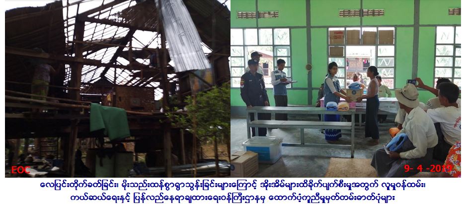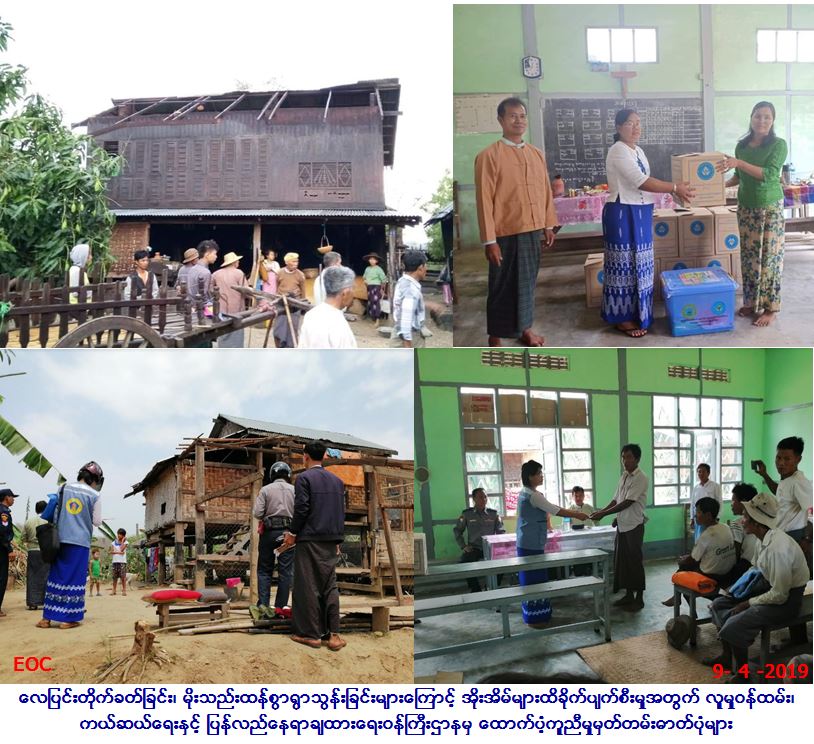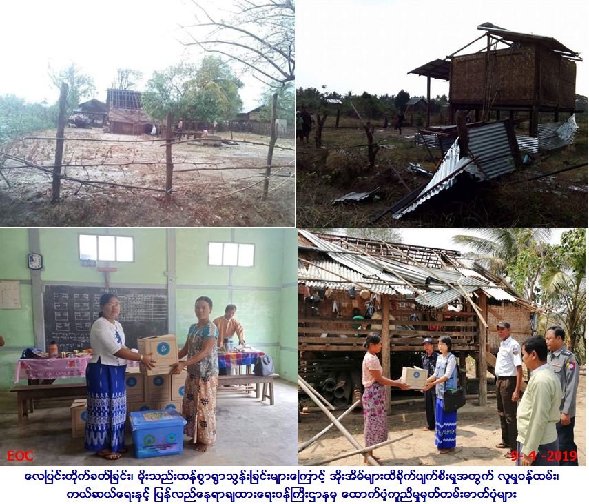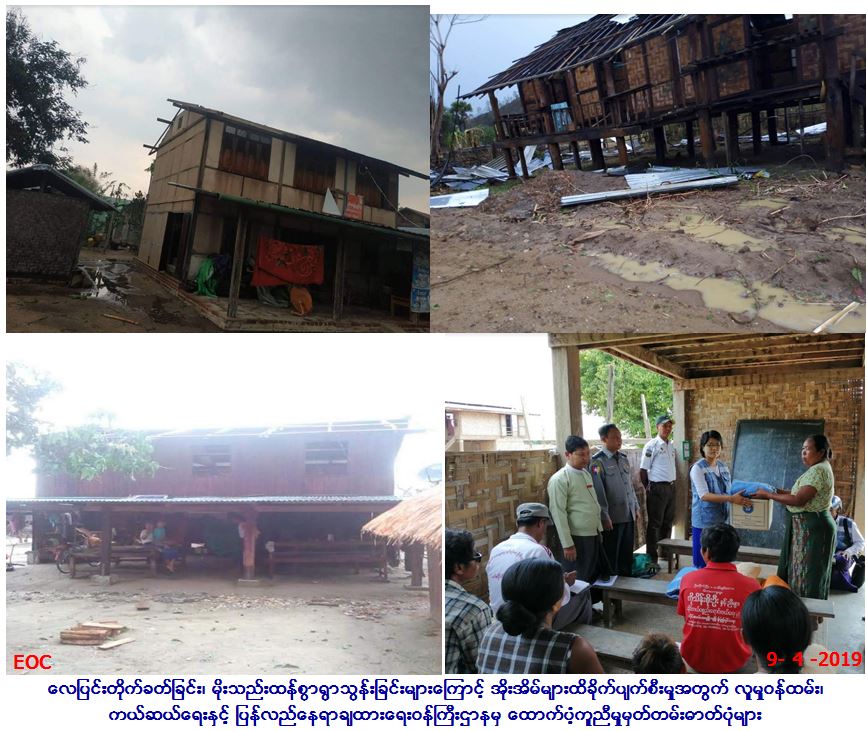 ၁။ ၂၀၁၉ ခုနှစ်၊ ဧပြီလ(၈)ရက်နေ့၌ လေပြင်းတိုက်ခတ်ခြင်း၊ မိုးသည်းထန်စွာ ရွာသွန်းခြင်းများ ဖြစ်ပွားခဲ့ရာ စစ်ကိုင်းတိုင်းဒေသကြီး၊ ကနီ၊ ကျွန်းလှ၊ ယင်းမာပင်၊ တန့်ဆည်၊ မော်လိုက်၊ ကသာ၊ ကန့်ဘလူနှင့် ကောလင်းမြို့နယ်တို့တွင် နေအိမ်(၄၀၀)လုံးခန့်နှင့် ဘာသာ ရေးအဆောက်အဦ(၇)လုံး အမိုးအကာများ ပျက်စီးခဲ့ကြောင်းသိရှိရပါသည်။