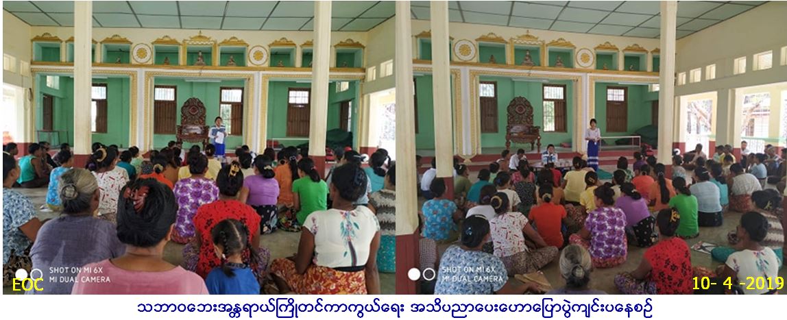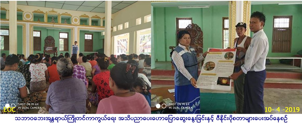 လူမှုဝန်ထမ်း၊ ကယ်ဆယ်ရေးနှင့်ပြန်လည်နေရာ ချထားရေးဝန်ကြီးဌာန၊ ကျိုက်ထိုမြို့နယ်ဦးစီးမှူး ရုံးမှ တာဝန်ရှိသူများသည် မွန်ပြည် နယ်၊ သထုံခရိုင်၊ (၁၀-၄-၂၀၁၉) ရက်နေ့၊ နံနက်(၁၀:၀၀)နာရီအချိန်မှ (၁၁:၃၀)နာရီအချိန် ထိ စစ်တောင်းကျေးရွာ၊ ကျိုက္ကလွန်ပွန်း ဓမ္မာရုံ၌ လူဦးရေ(၁၅၅)ဦးခန့်အား မြို့နယ် သဘာဝဘေးကော်မတီအဖွဲ့ဝင်များနှင့် ပူးပေါင်း၍ သဘာဝဘေးအန္တရာယ်ကြိုတင် ကာကွယ် ရေး အသိပညာပေးဟောပြောပွဲ ကျင်းပခဲ့ပြီး လက်ကမ်းစာစောင်များ လည်းဖြန့်ဝေခဲ့ရာ ပြည်သူလူထုများစိတ်ဝင်စား စွာ တက်ရောက် ခဲ့ပါကြောင်း သတင်းရရှိပါ သည်။