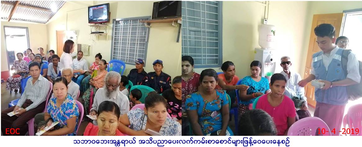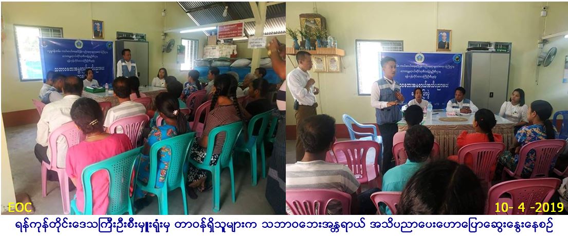 လူမှုဝန်ထမ်း၊ ကယ်ဆယ်ရေးနှင့်ပြန်လည်နေရာ ချထားရေးဝန်ကြီးဌာန၊ ရန်ကုန်တိုင်းဒေသကြီး ဦးစီးမှူးရုံးမှ တာဝန်ရှိသူများသည် ရန်ကုန်တိုင်းဒေသကြီး၊ သန်လျင်မြို့နယ်၊ ဒါရ်ကာရပ်ကွက်၌ (၁၀-၄-၂၀၁၉)ရက်နေ့တွင် ပြည်သူလူထု (၁၀၀)ဦးအား သဘာဝဘေး အန္တရာယ် အသိပညာပေး ဆွေးနွေးဟောပြောခဲ့ပြီး လက်ကမ်း စာစောင်များနှင့် ဗီနိုင်းပိုစတာများဖြန့်ဝေပေး ခဲ့ပါကြောင်း သတင်းရရှိပါသည်။
