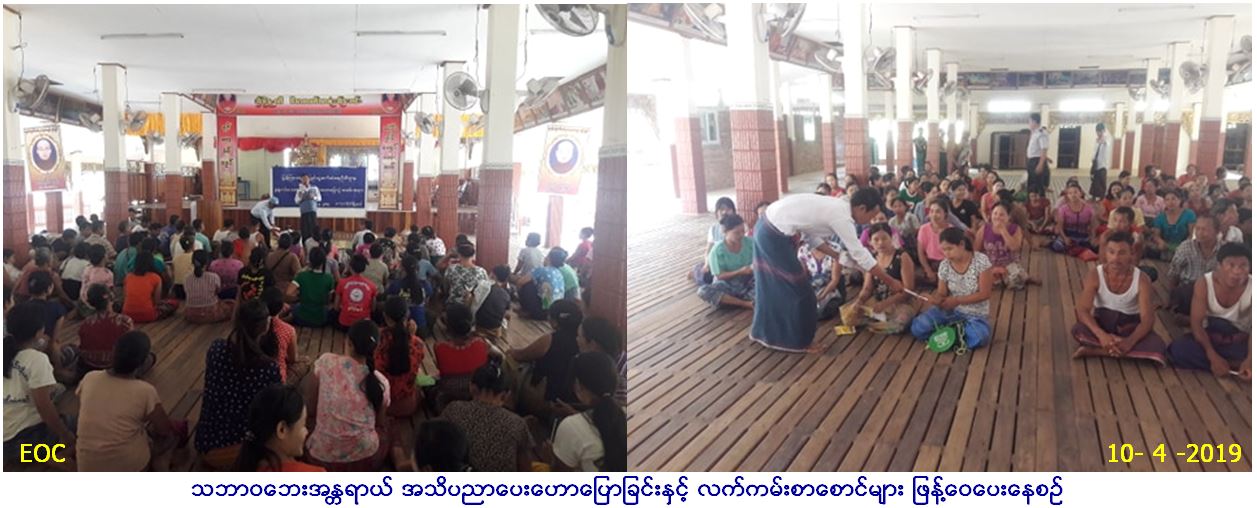 လူမှုဝန်ထမ်း၊ ကယ်ဆယ်ရေးနှင့်ပြန်လည်နေရာ ချထားရေးဝန်ကြီးဌာန၊ ကော့ကရိတ်ခရိုင်ဦးစီး မှူးရုံးမှ တာဝန်ရှိသူများသည် (၁၀.၄.၂၀၁၉) ရက်နေ့ (၁၀း၀၀)နာရီတွင် ကော့ကရိတ်မြို့နယ်၊ သမိန်ဒွတ်ကျေးရွာဘုန်းတော်ကြီးကျောင်းဓမ္မာရုံတွင် လူဦးရေ (၂၀၀) ဦးခန့်အား ပြန်ကြားရေးနှင့် ပြည်သူ့ဆက်ဆံရေးဦးစီးဌာန၊ သစ်တောဦးစီးဌာန၊ စားသုံးသူရေးရာဦးစီးဌာန တို့နှင့်ပူးပေါင်း၍ သဘာဝဘေးအန္တရာယ် အသိပညာပေးဟောပြောခဲ့ပြီး လက်ကမ်းစာစောင်များဝေငှခဲ့ပါကြောင်း သတင်းရရှိပါသည်။