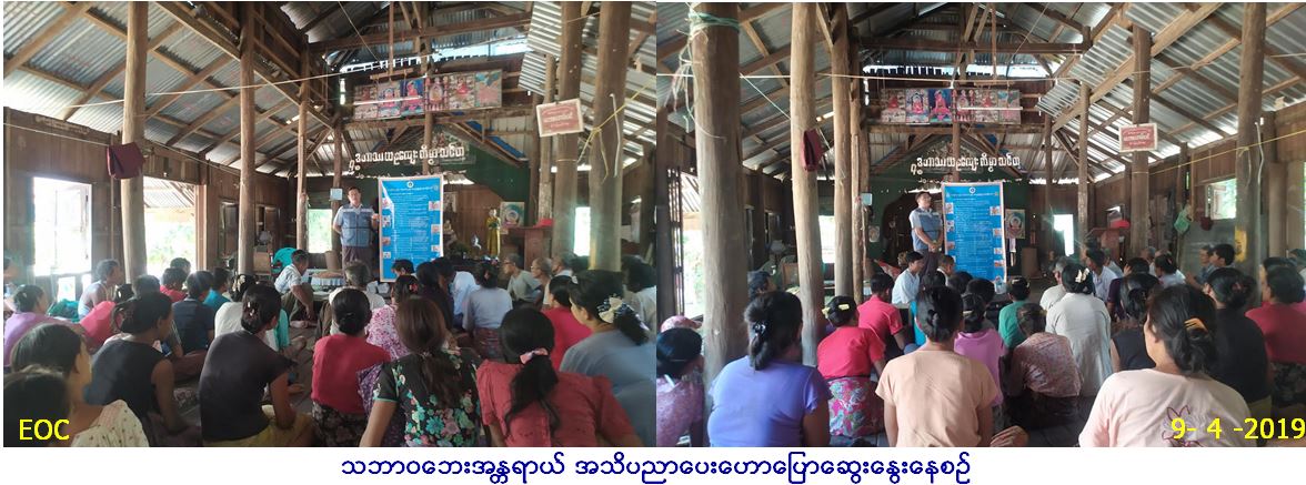 လူမှုဝန်ထမ်း၊ ကယ်ဆယ်ရေးနှင့်ပြန်လည်နေ ရာချထားရေးဝန်ကြီးဌာန၊ ဧရာဝတီတိုင်းဒေသကြီးဦးစီးမှူးရုံးမှ တာဝန်ရှိသူများသည် ငပုတောမြို့နယ်၊ ဟိုင်းကြီးကျွန်းမြို့၊ ဖောင်တိုးကျေးရွာအုပ်စု၊ ဖောင်တိုးကျေးရွာ၌ (၉-၄-၂၀၁၉)ရက်နေ့ (၁၁း၀၀)နာရီအချိန်တွင် သဘာဝဘေးလျော့ပါးရေးအသိပညာပေးဟောပြောပွဲအား ကျင်းပပြုလုပ်ခဲ့ရာ ကျေးရွာပြည်သူလူထု (၁၀၀)ဦးခန့် တက်ရောက်ခဲ့ပြီး တက်ရောက်လာသူများအား လက်ကမ်းစာစောင်များ၊ ဗွီနိုင်းပိုစတာများ ဖြန့်ဝေပေးခဲ့ပါကြောင်း သတင်းရရှိပါသည်။