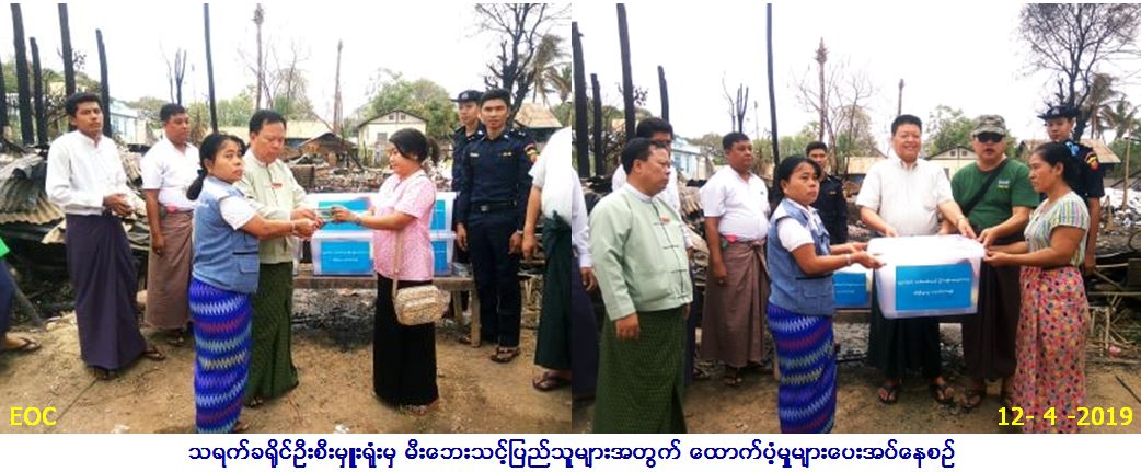 လူမှုဝန်ထမ်း၊ ကယ်ဆယ်ရေးနှင့်ပြန်လည်နေရာ ချထားရေးဝန်ကြီးဌာန၊ ဘေးအန္တရာယ်ဆိုင်ရာ စီမံခန့်ခွဲမှုဦးစီးဌာန၊ သရက်ခရိုင်ဦးစီး မှူးရုံးမှ တာဝန်ရှိသူများသည် သရက်မြို့နယ်၊ အမှတ်(၆)ရပ်ကွက်၊ ပွဲစားလမ်းတွင် (၁၁.၄.၂၀၁၉) ရက်နေ့၊ (၁၆း၁၀)နာရီအချိန်၌ မီးလောင်ကျွမ်းမှုကြောင့် နေအိမ်(၇)လုံး မီးဘေးသင့်ခဲ့ပြီး အိမ်ခြေ(၇)လုံး၊ အိမ်ထောင်စု(၇)စု၊ လူဦးရေစုစုပေါင်း (၄၂)ဦး မီးဘေးသင့် ခဲ့ရာ ဘေးသင့်လူဦးရေ (၄၂)ဦးအတွက် ဆန်ရိက္ခာဖိုး(၇)ရက်စာ (၈၈,၂၀၀/-)ကျပ်၊ နေအိမ်(၇)လုံးအတွက် အိမ်ဆောက်ပစ္စည်းဖိုး (၁,၄၀၀,၀၀၀/-)ကျပ်၊ ရန်ပုံငွေစုစုပေါင်း (၁၄၈,၈၂၀၀/-)ကျပ်နှင့် ကယ်ဆယ်ရေးပစ္စည်း(၁၅)မျိုး (၇)အိမ်ထောင်စာတို့အား (၁၂.၄.၂၀၁၉)ရက်နေ့တွင် သရက်မြို့နယ်ထွေထွေအုပ်ချုပ်ရေးဦးစီးဌာနမှ တာဝန်ရှိသူများရှေ့မှောက်တွင် ဘေးသင့်ပြည်သူများ၏ လက်ဝယ်သို့် သွားရောက်ထောက်ပံ့ပေးအပ်ခဲ့ပါကြောင်း သတင်းရရှိပါသည်။