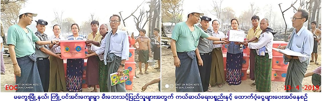 လူမှုဝန်ထမ်း၊ ကယ်ဆယ်ရေးနှင့် ပြန်လည်နေရာချထားရေးဝန်ကြီးဌာန၊ ဘေးအန္တရာယ်ဆိုင်ရာစီမံခန့့်ခွဲမှုဦးစီးဌာန၊ မကွေးတိုင်းဒေသကြီးဦးစီးမှူးရုံးမှ တာဝန်ရှိသူများသည် မကွေးမြို့နယ်၊ ကြာကန်ကျေးရွာအုပ်စု၊ ကြို့ပင်အင်းကျေးရွာတွင် (၁၃-၄-၂၀၁၉)ရက်နေ့ (၁၃း၃၀)နာရီအချိန်တွင် ဖြစ်ပွားခဲ့သော မီးဘေးကြောင့် အိမ်ခြေ(၃၂)လုံး၊ အိမ်ထောင်စု (၃၂)စု မီးဘေးသင့်ခဲ့ရာ အိမ်ခြေ (၃၂)လုံးအတွက် ကယ်ဆယ်ရေးပစ္စည်း(၁၅)မျိုး၊ လူဦးရေ(၁၁၅)ဦးအတွက် ဆန်ရိက္ခာ(၇) ရက်စာ (၂၄၁,၅၀၀/-)ကျပ်တို့အား (၁၃-၄-၂၀၁၉)ရက်နေ့ (၁၅း၃၀)အချိန်တွင် အထွေထွေအုပ်ချုပ်ရေးဦးစီးဌာနမှ တာဝန်ရှိသူများနှင့် အတူ ဘေးသင့်ပြည်သူများလက်ဝယ်အရောက် သွားရောက်ထောက်ပံ့ပေးအပ်ခဲ့ပါကြောင်း သတင်းရရှိပါသည်။