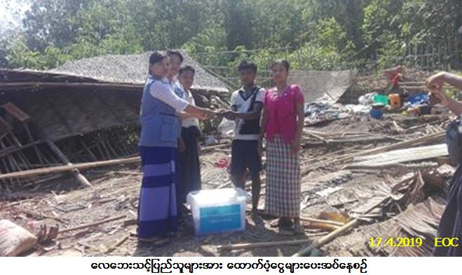 လူမှုဝန်ထမ်း၊ ကယ်ဆယ်ရေးနှင့် ပြန်လည်နေရာချထားရေးဝန်ကြီးဌာန၊ ဘေးအန္တရာယ်ဆိုင်ရာစီမံခန့်ခွဲမှုဦးစီးဌာန၊ မြိတ်ခရိုင်ဦးစီးမှူးရုံးမှတာဝန်ရှိသူများသည် တနင်္သာရီမြို့နယ်၊ တမုတ်ချုံးကျေးရွာအုပ်စု၊ ရှမ်းအင်းတော်ကျေးရွာ၌ (၁၆-၄-၂၀၁၉) ရက်နေ့တွင် ဖြစ်ပွားခဲ့သောလေပြင်းတိုက်ခတ်မှုကြောင့် ပြိုကျပျက်စီးနေအိမ် (၁) လုံး၊ အိမ်ထောင်စု (၁) စုမှ လူဦးရေ (၃) ဦးဘေးသင့်ခဲ့ရာ အဆိုပါဘေးသင့်ပြည်သူများအတွက် ကယ်ဆယ်ရေးပစ္စည်း (၁၅) မျိုး (၁) အိမ်ထောင်စုစာ၊ အိမ်ဆောက်ပစ္စည်းဖိုးထောက်ပံ့ငွေ (၁၀၀,၀၀၀/-) ကျပ်နှင့် ဆန်ရိက္ခာဖိုးထောက်ပံ့ငွေ (၆,၃၀၀/-) ကျပ်အား (၁၇-၄-၂၀၁၉) ရက်နေ့၊ (၁၀း၀၀) နာရီအချိန်တွင် ဘေးသင့်ပြည်သူများထံသို့ သွားရောက်ထောက်ပံ့ပေးအပ်ခဲ့ပါကြောင်း သတင်းရရှိပါသည်။