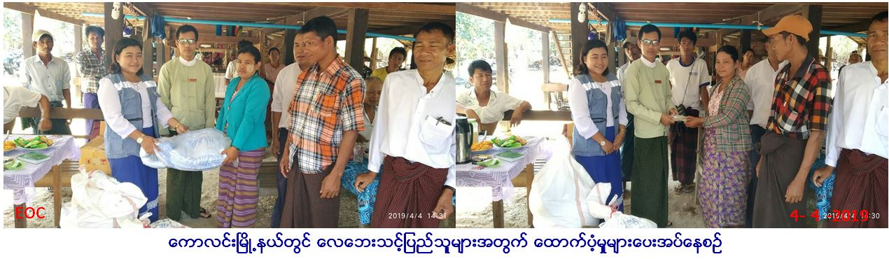 လူမှုဝန်ထမ်း၊ ကယ်ဆယ်ရေးနှင့် ပြန်လည်နေရာချထားရေးဝန်ကြီးဌာန၊ ဘေးအန္တရာယ်ဆိုင်ရာစီမံခန့်ခွဲမှုဦးစီးဌာန၊ ကောလင်းမြို့နယ်ဦးစီးမှူးရုံးမှ တာဝန်ရှိသူများသည် ကောလင်းမြို့နယ်၊ ပန်းမရဲကျေးရွာအုပ်စု၊ အောင်ချမ်းသာကျေးရွာ၊ ရွာသစ်ကျေးရွာနှင့် ပေတပင်ကျေးရွာတို့ တွင်(၂.၄.၂၀၁၉)ရက်နေ့ (၁၈း၀၀)နာရီ အချိန်တွင် လေပြင်းတိုက်ခတ် မှုကြောင့် အမိုးလန်သွားသော ဘုန်းကြီးကျောင်း(၃)ကျောင်း၊ ကိုယ်ထူကိုယ်ထဖြင့် ဆောက်လုပ်ထားသော ဝန်ထမ်းအိမ်(၂)အိမ်၊ အိမ်ထောင်စု(၅၂)စု၊ ကယ်ဆယ်ရေးပစ္စည်း(၅)မျိုးနှင့် အိမ်ဆောက်ပစ္စည်းထောက်ပံ့ငွေ စုစုပေါင်း (၁,၅၀၀,၀၀၀/-)ကျပ် (တစ်ဆယ့်ငါးသိန်းတိတိ) အား (၄.၄.၂၀၁၉)ရက်နေ့ (၂း၀၀)နာရီ အချိန်တွင် ဘေးသင့်ပြည်သူတို့ လက်ဝယ်အရောက် ထောက်ပံ့ပေး အပ်ခဲ့ကြောင်း သတင်းရရှိပါသည်။