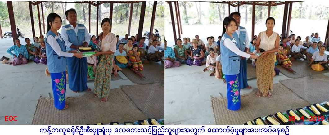 လူမှုဝန်ထမ်း၊ ကယ်ဆယ်ရေးနှင့် ပြန်လည်နေရာချထားရေးဝန်ကြီးဌာန၊ ဘေးအန္တရာယ်ဆိုင်ရာစီမံခန့်ခွဲမှုဦးစီးဌာန၊ ကန့်ဘလူခရိုင် ဦးစီးမှူးရုံးမှ တာဝန်ရှိသူများသည် (၁၅-၄-၂၀၁၉) ရက်နေ့တွင် လေပြင်းတိုက်ခတ်၍ မိုးသီးကြွေကျမှုကြောင့် ကန့်ဘလူခရိုင်၊ ကျွန်းလှ မြို့နယ်၊ ညောင်ကုန်းကျေးရွာအုပ်စုရှိ လူနေအိမ်(၆၈)အိမ်မှ အိမ်ထောင်စု (၆၈)စုအတွက် အိမ်ဆောက်ပစ္စည်း ဖိုးထောက်ပံ့ငွေ (၁,၃၃၀,၀၀၀/-)ကျပ်၊ ကယ်ဆယ်ရေးပစ္စည်း(၅)မျိုး (၆၈)အိမ်ထောင်စာတို့အား (၁၈-၄-၂၀၁၉)ရက်နေ့တွင် ညောင်ကိုင်းကျေးရွာရှိ ဘေးသင့်ပြည်သူထံသို့ ကွင်းဆင်းထောက်ပံ့ပေး အပ်ခဲ့ကြောင်း သတင်းရရှိပါသည်။
