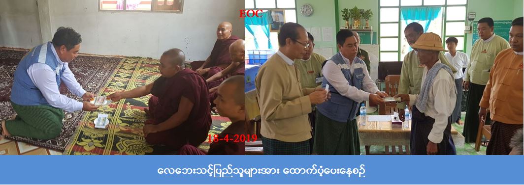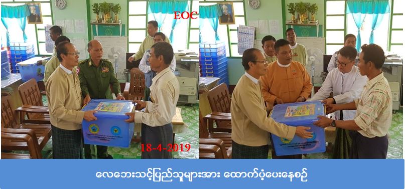 (၁၇-၄-၂၀၁၉)ရက်နေ့(၁၆:၃၀) အချိန်တွင် နေပြည်တော်ကောင်စီနယ်မြေအတွင်း မိုးသည်းထန်စွာရွာသွန်းပြီး လေပြင်းတိုက်ခတ်မှုကြောင့် ပြည်ထောင်စုနယ်မြေ၊နေပြည်တော်အတွင်း အမိုးလန်ပျက်စီးအိမ်(၂၁၂)လုံး၊ပြိုလဲပျက်စီးအိမ်(၈)လုံး၊ စာသင်ကျောင်း(၆) ကျောင်းအမိုးလန်ခြင်း၊ ဘုန်းကြီးကျောင်း(၆)ကျောင်းအမိုးလန်ခြင်း ဖြစ်ပွားခဲ့ပါကြောင်း ဘေးသတင်းရရှိခဲ့ပါသည်။သို့ဖြစ်ပါ၍ နေပြည်တော်ကောင်စီ ဥက္ကဋ္ဌဒေါက်တာမျိုးအောင် ၊ နေပြည်တော်ကောင်စီဝင်ဗိုလ်မှူးကြီးမင်းနောင်၊အမျိုးသားလွတ်တော်ကိုယ်စားလှယ်ဦးကျော်မင်းနိုင်၊တိုင်းအ ဆင့်ဌာနဆိုင်ရာမှ တာဝန်ရှိသူများ၊ခရိုင်အဆင့်ဌာနဆိုင်ရာမှ တာဝန်ရှိသူများနှင့်အတူ လူမှုဝန်ထမ်း၊ ကယ်ဆယ် ရေးနှင့် ပြန်လည်နေရာချထားရေးဝန်ကြီးဌာန၊ ဘေးအန္တရာယ်ဆိုင်ရာစီမံခန့်ခွဲမှုဦးစီးဌာန၊ ပြည်ထောင်စုနယ်မြေ၊ နေပြည်တော်တိုင်းဦးစီးမှူးရုံးမှ တိုင်းဦးစီးမှူးနှင့် တာဝန်ရှိသူတို့သည်အောင်ချမ်းသိမ်းကျေးရွာ၊ မင်းကုန်းကျေး ရွာ၊ အောင်ချမ်းသာကျေးရွာ၊ ဖောင်းလောင်းကျေးရွာ၊ ဇလောင်း(တောင်၊မြောက်)ကျေးရွာ၊ ငန်းစပ်ကျေးရွာ၊ရွှေနံသာရပ်ကွက်တို့တွင် ဘေးသင့်အိမ်ခြေ(၉၉)လုံးနှင့်လူဦးရေ(၃၈၉) ဦးအတွက် ကယ်ဆယ်ရေး ပစ္စည်း (၁၁)မျိုး၊ စုစုပေါင်းအိမ်ဆေါက်ပစ္စည်းရန်ပုံငွေ(၄,၇၄၀,၀၀၀)ကျပ်၊ဆန်ရိက္ခာဖိုးငွေ (၈၁၆,၉၀၀)ကျပ်တို့အား (၁၈-၄-၂၀၁၉)ရက်နေ့တွင်သွားရောက်၍ ကွင်းဆင်းထောက်ပံ့ခဲ့ပြီး ကျန်ရှိပျက်စီးအိမ်များအတွက် ထောက်ပံ့မှုများကို ဆက်လက်ဆောင်ရွက်သွားမည်ဖြစ်ကြောင်း သိရှိရပါသည်။