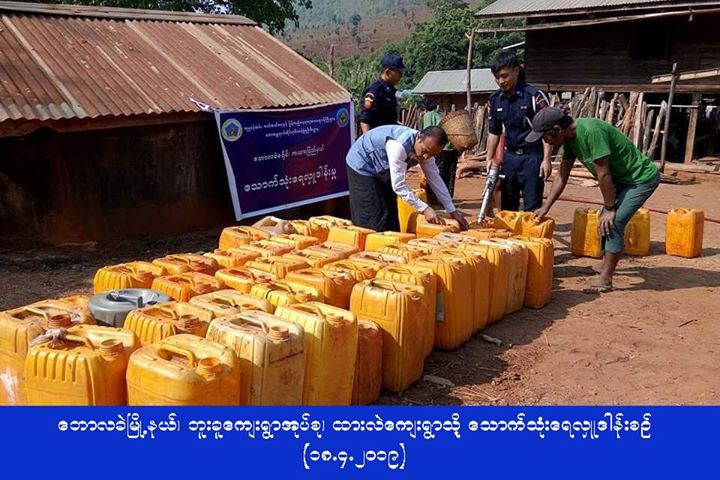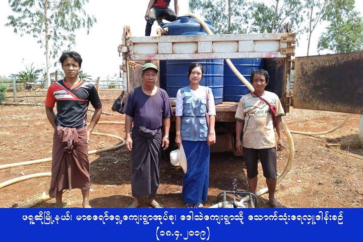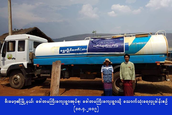 လူမှုဝန်ထမ်း၊ ကယ်ဆယ်ရေးနှင့်ပြန်လည်နေရာချထားရေးဝန်ကြီးဌာန၊ ဘေးအန္တရာယ်ဆိုင်ရာစီမံခန့်ခွဲမှုဦးစီးဌာန၊ ကယားပြည်နယ်ဦးစီးမှူးရုံးမှ တာဝန်ရှိသူများသည် (၁၇.၄.၂၀၁၉) ရက်နေ့တွင် ဖရူဆိုမြို့နယ်၊ မာခရော်ရှေ့ကျေးရွာအုပ်စု၊ ဒေါသဲကျေးရွာနှင့် တနောကလောကျေးရွာ များသို့ ဂါလံ(၁၀၀၀)ဆံ့ ရေသယ်ယာဉ်(၂)စီး၊ ဒီးမော့ဆိုမြို့နယ်၊ ဒေါတမကြီးကျေးရွာအုပ်စု၊ ဒေါတမကြီးကျေးရွာသို့ ဂါလံ(၃၀၀၀)ဆံ့ ရေသယ်ယာဉ်(၁)စီး၊ ဘောလခဲမြို့နယ်၊ ဘူးခူကျေးရွာအုပ်စု၊ ထားလဲကျေးရွာသို့ ဂါလံ(၁၆၀၀)ဆံ့ရေသယ်ယာဉ်(၂)စီး၊ စုစုပေါင်းရေသယ်ယာဉ် (၅)စီးဖြင့် ဒီးမော့ဆို၊ ဖရူဆို၊ ဘောလခဲမြို့နယ်အုပ်ချုပ်ရေးမှူးရုံးမှ ဝန်ထမ်းများနှင့်အတူ သောက်သုံးရေများ သွားရောက် ဖြန့်ဝေပေးခဲ့ကြောင်း သတင်း ရရှိပါသည်။