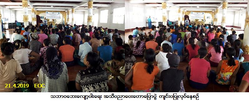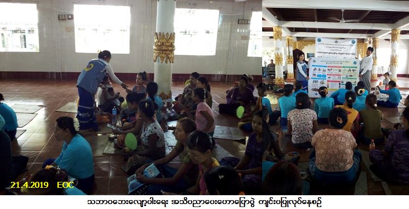 လူမှုဝန်ထမ်း၊ ကယ်ဆယ်ရေးနှင့် ပြန်လည်နေရာချထားရေးဝန်ကြီးဌာန၊ ဘေးအန္တရာယ်ဆိုင်ရာစီမံခန့်ခွဲမှုဦးစီးဌာန၊ လပွတ္တာခရိုင်ဦးစီးမှူးရုံးမှတာဝန်ရှိသူများသည် လပွတ္တာမြို့နယ်၊ ကန်ဘက်ကျေးရွာအုပ်စု၊ ကန်ဘက်ကျေးရွာ၌ (၂၁-၄-၂၀၁၉) ရက်နေ့၊ နံနက် (၁၀း၀၀) နာရီအချိန်တွင် သဘာဝဘေးလျော့ပါးရေး အသိပညာပေးဟောပြောပွဲ ကျင်းပပြုလုပ်ခဲ့ရာ ကျေးရွာနေပြည်သူ (၁၅၀) ဦးခန့်တက်ရောက်ခဲ့ပြီး တက်ရောက်လာသူများအား ဘေးရှစ်မျိုးလက်ကမ်းစာစောင်များဝေငှခြင်းနှင့် ကျေးရွာအုပ်ချုပ်ရေးမှူးထံသို့ ဗွီနိုင်းပိုစတာများပေးအပ်ခြင်းတို့ ဆောင်ရွက်ခဲ့ပါကြောင်း သတင်းရရှိပါသည်။