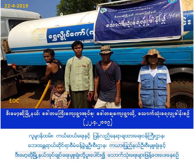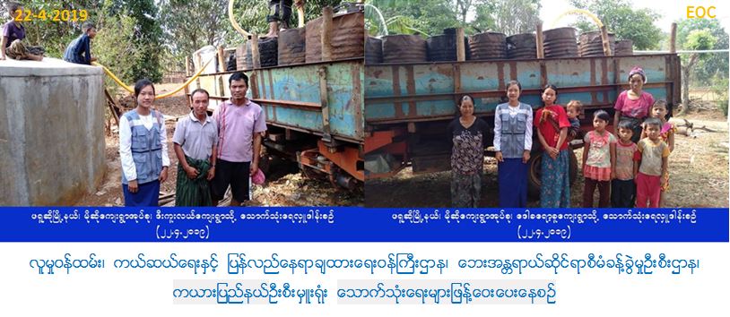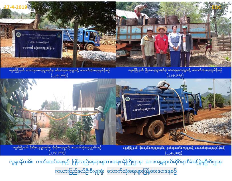 လူမှုဝန်ထမ်း၊ ကယ်ဆယ်ရေးနှင့် ပြန်လည်နေရာချထားရေးဝန်ကြီးဌာန၊ ဘေးအန္တရာယ်ဆိုင်ရာစီမံခန့်ခွဲမှုဦးစီးဌာန၊ ကယားပြည်နယ်ဦးစီးမှူးရုံးမှ တာဝန်ရှိသူများသည် (၂၂-၄-၂၀၁၉)ရက်နေ့တွင် သောက်သုံးရေရှားပါးလျက်ရှိသော ဖရူဆိုမြို့နယ်၊ မိုဆိုကျးရွာအုပ်စု၊ မိုဆိုကျေးရွာ၊ ဒီးကူးလယ်ကျေးရွာ၊ ထီးဒီးကူးကျေးရွာ၊ ဒေါခရော့ခူကျေးရွာ၊ မြို့မကျေးရွာအုပ်စု လောခုခူကျေးရွာ၊ ဒိုးပရယ်ကျေးရွာအုပ်စု ဝှယ်သူတော်ကျေးရွာ၊ ကေးလျားကျေးရွာအုပ်စု ထီးသဲကူးကျေးရွာများသို့ ဂါလံ(၁၂၅၀)ဆံ့ရေသယ်ယာဉ် (၃)စီး၊ ဂါလံ(၁၀၀၀)ဆံ့ရေသယ်ယာဉ်(၄)စီ၊ ဒီးမော့ဆိုမြို့နယ်၊ ဒေါတမကြီးကျေးရွာအုပ်စု ဒေါတချကျေးရွာသို့ ဂါလံ(၃၀၀၀)ဆံ့ရေသယ်ယာဉ်(၁)စီး စုစုပေါင်း ရေသယ်ယာဉ်(၈)စီးဖြင့် ဒီးမော့ဆိုနှင့်ဖရူဆိုမြို့နယ်အုပ်ချုပ်ရေးမှူးရုံးမှတာဝန်ရှိသူများ၊ ဘေးအန္တရာယ်ဆိုင်ရာစီမံခန့်ခွဲ့မှုဦးစီးဌာန၊ ကယားပြည်နယ်ဦးစီးမှူးရုံးမှ တာဝန် ရှိသူများ ပါဝင်သည့်အဖွဲ့သည် သောက်သုံးရေများသွားရောက် ဖြန့်ဝေပေးခဲ့ကြောင်း သတင်းရရှိပါသည်။