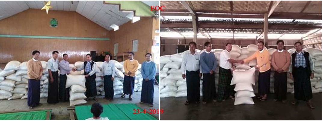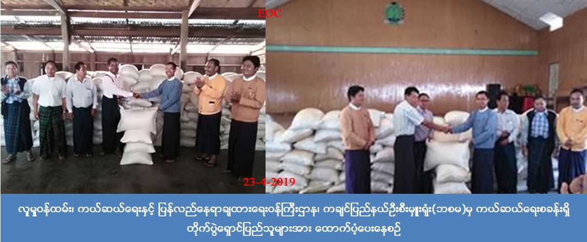ကချင်ပြည်နယ်၊ မြစ်ကြီးနားခရိုင်၊ တနိုင်းမြို့နယ်၊ ကယ်ဆယ်ရေးစခန်း (၄)ခုရှိ တိုက်ပွဲရှောင်ပြည်သူအိမ်ထောင်စု(၃၁၅)စု၊ လူဦးရေ(၁,၁၁၉)ဦးအတွက် ဆန်ရိက္ခာ(၁)လစာထောက်ပံ့ပေး ရန်အတွက် လူမှုဝန်ထမ်း၊ ကယ်ဆယ်ရေးနှင့် ပြန်လည်နေရာ ချထားရေးဝန်ကြီးဌာန၊ ဘေးအန္တရာယ်ဆိုင်ရာ စီမံခန့်ခွဲမှုဦးစီးဌာန၊ ကချင်ပြည်နယ်ဦးစီးမှူးရုံးမှ အဆိုပါတိုက်ပွဲရှောင်ပြည်သူများအတွက် ဆန်ရိက္ခာ(၁)လစာကို သယံဇာတနှင့်ပတ်ဝန်း ကျင်ထိန်းသိမ်းရေးဝန်ကြီး ဦးဒါရှီလဆိုင်း၊ အမျိုးသားလွတ်တော်ကိုယ်စားလှယ် ဦးဝင်းဇော်၊ ဦးခင်မောင်မြင့်၊ ဦးနောင်နဂျာတန်တို့နှင့်အတူ (၂၃-၄-၂၀၁၉)ရက်နေ့တွင် သွားရောက်ထောက်ပံ့ခဲ့ကြောင်း သိရှိရပါသည်။