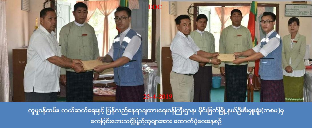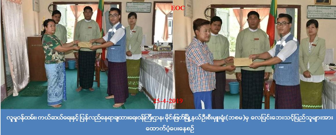 လူမှုဝန်ထမ်း၊ ကယ်ဆယ်ရေးနှင့် ပြန်လည်နေရာချထားရေးဝန်ကြီးဌာန၊ ဘေးအန္တရာယ်ဆိုင်ရာ စီမံခန့်ခွဲမှုဦးစီးဌာန၊ မိုင်းဖြတ်မြို့နယ်ဦးစီးမှူးရုံးမှ ဝန်ထမ်းများသည် မိုင်းဖြတ်မြို့နယ်တွင် (၂၃-၄-၂၀၁၉) ရက်နေ့တွင် လေပြင်းတိုက်ခတ်မှုကြောင့် ဝမ်ဟွေရပ်ကွက်၊ဘူးဖါးကျေးရွာနှင့် အေးဆုဒေ ကျေးရွာတို့တွင် သွပ်မိုးပျဉ်ကာအိမ်(၃)လုံး၊ ဓနိမိုးထရံကာအိမ်(၁)လုံးနှင့် ဘုန်းကြီးကျောင်း (၁) ကျောင်းလေဘေးသင့်ခဲ့ပြီး အဆိုပါလေဘေးသင့်သွပ်မိုးပျဉ်ကာအိမ်ထောင်စု(၃)စုအတွက် (၁)အိမ် ထောင်လျှင် (၁၀၀,၀၀၀)ကျပ်နှုန်းဖြင့် (၃၀၀,၀၀၀) ကျပ်၊ ဓနိမိုးထရံကာ အိမ်ထောင်စုအတွက် (၁၂,၀၀၀) ကျပ်နှင့်ဘုန်းကြီးကျောင်းအတွက် (၁၀၀,၀၀၀) ကျပ်၊ စုစု ပေါင်းထောက်ပံ့ငွေ(၄၁၂,၀၀၀) ကျပ်တို့ကို (၂၅-၄-၂၀၁၉)ရက်နေ့တွင် ထောက်ပံ့ပေးအပ်ခဲ့ကြောင်း သိရှိရပါသည်။