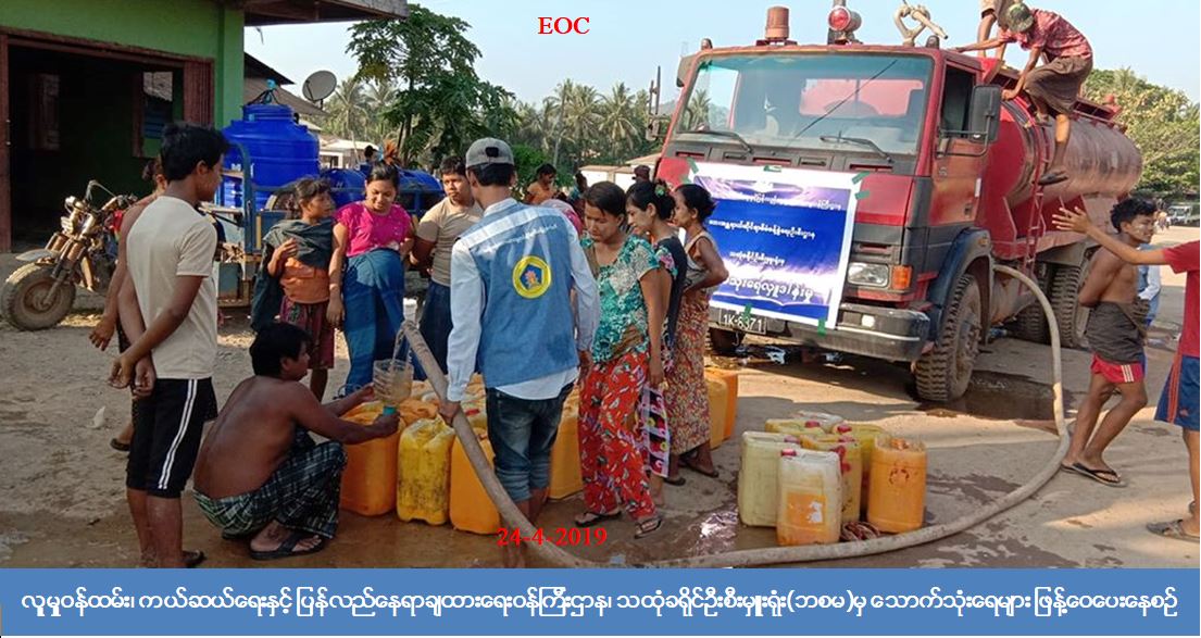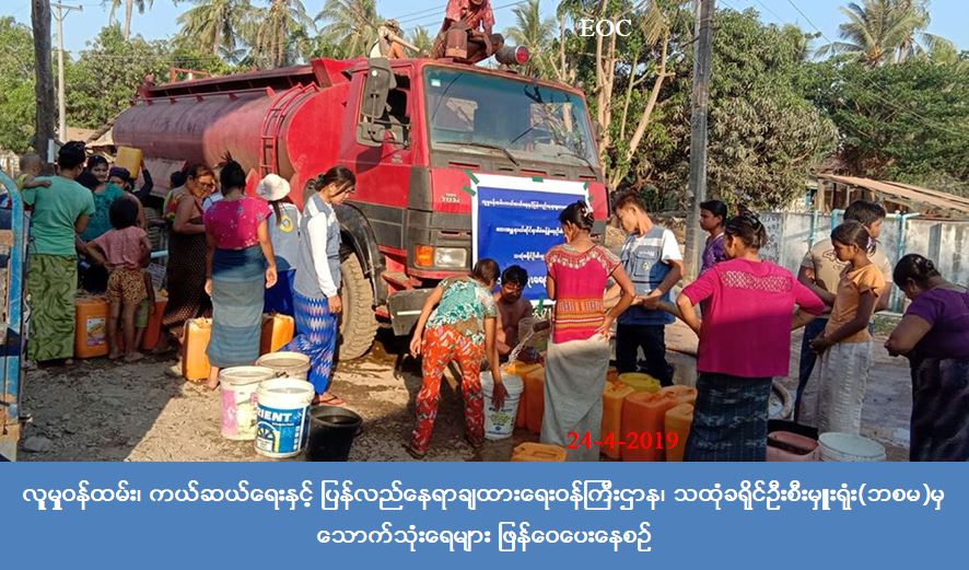 မွန်ပြည်နယ်၊သထုံမြို့နယ်အတွင်း သောက်သုံးရေရှားပါးနေသည့် ကန်ညီနောင်ရပ်ကွက်မှ အိမ်ခြေ (၄၀၀)နှုန်း၊ အိမ်ထောင်စု(၄၀၀)၊ လူဦးရေ(၂,၀၀၀)ဦးတို့အတွက် သောက်သုံးရေ ဂါလန်(၃,၂၀၀)တို့ကို (၂၄-၄-၂၀၁၉) ရက်နေ့တွင် လူမှုဝန်ထမ်း၊ ကယ်ဆယ်ရေးနှင့် ပြန်လည်နေရာချထားရေးဝန်ကြီးဌာန၊ ဘေးအန္တရာယ်ဆိုင်ရာ စီမံခန့်ခွဲမှုဦးစီးဌာန၊ သထုံခရိုင်ဦးစီးမှူးရုံးမှ တာဝန်ရှိသူများက ဖြန့်ဝေပေးခဲ့ကြောင်း သိရှိရပါသည်။