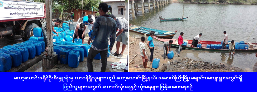 လူမှုဝန်ထမ်း၊ ကယ်ဆယ်ရေးနှင့် ပြန်လည်နေရာချထားရေးဝန်ကြီးဌာန၊ ကယ်ဆယ်ရေးနှင့် ပြန်လည်နေရာချထားရေးဦးစီးဌာန၊ ကော့သောင်းခရိုင်ဦးစီးမှူးရုံးမှ တာဝန်ရှိသူများသည် (၃၀-၄-၂၀၁၆) ရက်နေ့တွင် ကော့သောင်းမြို့နယ်၊ ခမောက်ကြီးမြို့၊ ချောင်းဝကျေးရွာအတွင်းရှိ ပြည်သူများအတွက် သောက်ရေ (ရေသန့်) (၁၀၀) ပုံးနှင့် သုံးရေ (တွင်းရေ) (၁၁၂) ပုံးတို့ အား ဖြန့်ဝေပေးခဲ့ကြောင်း သိရှိရပါသည်။