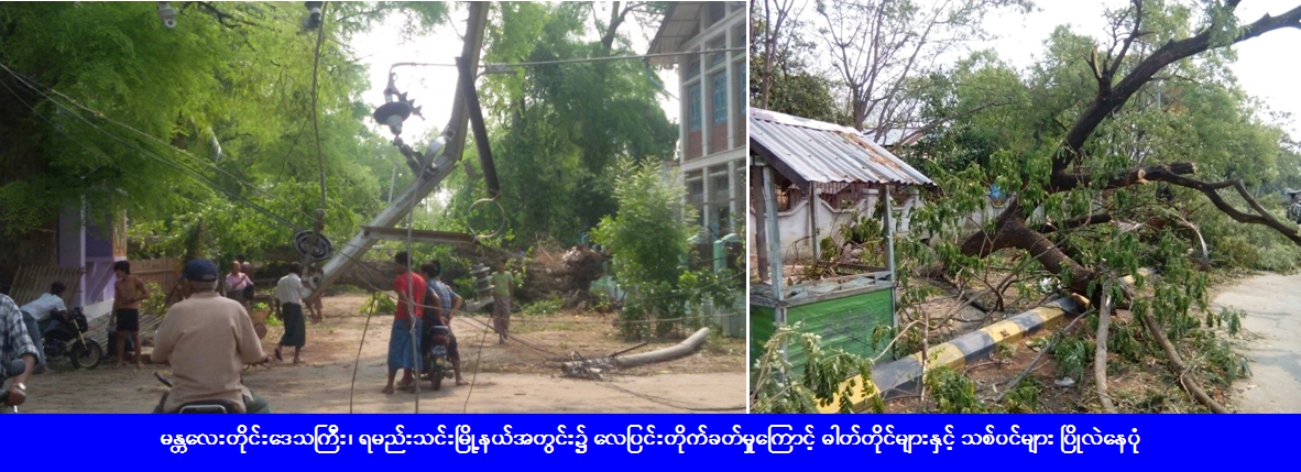 လူမှုဝန်ထမ်း၊ ကယ်ဆယ်ရေးနှင့် ပြန်လည်နေရာချထားရေးဝန်ကြီးဌာန၊ ကယ်ဆယ်ရေးနှင့် ပြန်လည်နေရာချထားရေးဦးစီးဌာနရုံးချုပ်၊ ညွှန်ကြားရေးမှူး ဦးစီးသောအဖွဲ့သည် လေဘေးသင့်ဒေသများသို့သွားရောက်၍ ထိခိုက်ပျက်စီးမှုနှင့် ကနဦးလိုအပ်ချက် ဆန်းစစ်မှုများအား ကွင်းဆင်းဆောင်ရွက်လျက်ရှိပြီး၊ မန္တလေးတိုင်းဦးစီးမှူးရုံး(ကဆရ) မှ တာဝန်ရှိသူများသည် ဒေသဆိုင်ရာအုပ်ချုပ်မှုအဖွဲ့များနှင့်ပူးပေါင်း၍ မန္တလေးတိုင်းဒေသကြီး၊ ရမည်းသင်းမြို့နယ်အတွင်းတွင် လေပြင်းတိုက်ခတ်မှုကြောင့် ပျက်စီးဆုံးရှုံးမှုများအား သွားရောက်ကြည့်ရှု့ခဲ့ကြောင်း သိရှိရပါသည်။