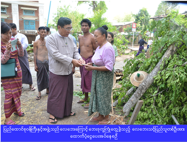ဆက်လက်၍ ရမည်းသင်းမြို့နယ်၊ ညောင်အိုင်ရွာ၊ မူလတန်း ကျောင်းသို့ရောက်ရှိပြီး လေဘေးသင့်ပြည်သူများအတွက် ယာယီဖွင့်လှစ် ထားသည့်ဆေးခန်းနှင့် ရေသန့်စင်စက်ဖြင့် သောက်ရေဖြန့်ဝေပေးနေမှုအား ကြည့်ရှုလေ့လာပြီး ပြိုကျနေအိမ် (၁၂) လုံးအတွက် ကျပ် (၆) သိန်းနှင့် ကလေး များအတွက် ကစားစရာအရုပ်များအားလည်းကောင်း၊ စျေးကုန်းရွာရှိ ပြိုကျ နေအိမ် (၄) လုံးအတွက် ကျပ် (၂) သိန်းနှင့် ကယ်ဆယ်ရေးပစ္စည်း များအားလည်းကောင်း ထောက်ပံ့ပေးအပ်ခဲ့ပြီး စာရင်းကောက်ယူဆဲဖြစ်သည့် ကျန်ဘေးသင့်ပြည်သူများအတွက် ထောက်ပံ့ငွေနှင့် ကယ်ဆယ်ရေးပစ္စည်းများ ဆက်လက်ထောက်ပံ့နိုင်ရေးနှင့် သေဆုံးသူကျန်ရှိသည့် ပြည်သူများအား စနစ် တကျကောက်ယူ၍ ဆက်လက်ထောက်ပံ့နိုင်ရေး တာဝန်ရှိသူများအား ဆွေးနွေးမှာကြား စီစဉ်ဆောင်ရွက်ပေးခဲ့ပါကြောင်း သိရှိရပါသည်။