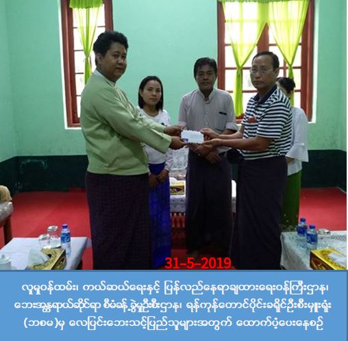 ရန်ကုန်တိုင်းဒေသကြီး၊ ရန်ကုန်တောင်ပိုင်းခရိုင်၊ ကွမ်းခြံကုန်းမြို့နယ်၊ ကံကြီး၊ မကျီးတန်းရပ်ကွက်တွင် (၂၇.၅.၂၀၁၉) ရက်နေ့တွင် လေပြင်းတိုက်ခတ်မှုကြောင့် နေအိမ်(၁)လုံးအမိုးပျက်စီးခဲ့ပြီး အိမ်ထောင်စု(၁)စုမှ လူဦးရေ(၇)ဦးတို့ လေဘေးသင့်ခဲ့ပါသဖြင့် လူမှုဝန်ထမ်း၊ ကယ်ဆယ်ရေးနှင့်ပြန်လည်နေရာချထားရေး ဝန်ကြီး ဌာန၊ ဘေးအန္တရာယ်ဆိုင်ရာစီမံခန့်ခွဲမှုဦးစီးဌာန၊ ရန်ကုန်တောင်ပိုင်းဦးစီးမှူးရုံးမှ (၃၁.၅.၂၀၁၉)ရက်နေ့တွင် အိမ်ဆောက်ပစ္စည်းဖိုးငွေကျပ် (၁၀၀,၀၀၀)ကျပ်နှင့် ဆန်ရိက္ခာ(၇)ရက်စာဖိုး ငွေကျပ်(၁၄,၇၀၀)ကျပ်၊ စုစုပေါင်း ထောက်ပံ့ငွေကျပ် (၁၁၄,၇၀၀)ကျပ်တို့ကိုအထွေထွေအုပ်ချုပ်ရေးဦးစီးဌာနမှတာဝန်ရှိသူများနှင်အတူ ဘေးသင့် ပြည်သူများ၏လက်ဝယ်သို့ သွားရောက် ထောက်ပံ့ပေးခဲ့ကြောင်း သိရှိရပါသည်။