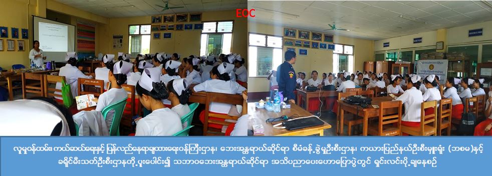 ကယားပြည်နယ်၊ လွိုင်ကော်သူနာပြုနှင့်သားဖွားသင်တန်းကျောင်းတွင် (၂၉.၅.၂၀၁၉) ရက်နေ့နှင့် (၃၀.၅.၂၀၁၉) ရက်နေ့တို့တွင် သဘာဝဘေးအန္တရာယ်ဆိုင်ရာအသိပညာပေးဟောပြောပွဲပြုလုပ်ခဲ့ရာ လူမှုဝန်ထမ်း၊ ကယ်ဆယ်ရေးနှင့်ပြန်လည်နေရာချထားရေး ဝန်ကြီးဌာန၊ ဘေးအန္တရာယ်ဆိုင်ရာ စီမံခန့်ခွဲမှု ဦးစီးဌာန၊ ကယားပြည်နယ်ဦးစီးမှူးရုံးမှ တာဝန်ရှိသူများသည် ခရိုင်မီးသတ်ဦးစီးဌာနမှ တာဝန်ရှိသူများနှင့် ပူးပေါင်း၍ မီးဘေး၊ ကျးလက်နေအိမ်များ သဘာဝဘေးဒဏ် ခံနိုင်ရည်မြှင့်ရန် အကြံပြုချက်များကို ဆွေးနွေး ဟောပြောခဲ့ပြီး ဆရာ/ ဆရာမ/ သင်တန်းသား သင်တန်းသူ စုစုပေါင်း (၁၀၅) ဦး တက်ရောက်ခဲ့ကြောင်း သိရှိရပါသည်။