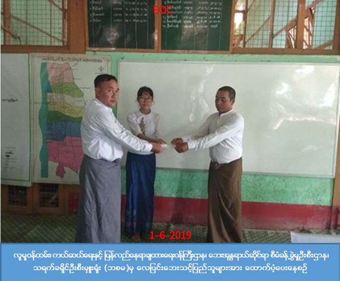 လူမှုဝန်ထမ်း၊ ကယ်ဆယ်ရေးနှင့် ပြန်လည်နေရာချထားရေးဝန်ကြီးဌာန၊ ဘေးအန္တရာယ်ဆိုင်ရာ စီမံခန့်ခွဲမှု ဦးစီး ဌာန၊ သရက်ခရိုင်ဦးစီးမှူးရုံးမှ တာဝန်ရှိသူများသည် အောင်လံမြို့နယ်၊ ဗိုလ်လုကုန်းကျေးရွာ အုပ်စု၊ ဗိုလ်လု ကုန်းကျေးရွာတွင် (၂၈.၅.၂၀၁၉) ရက်နေ့တွင် လေပြင်းတိုက်ခတ်မှုကြောင့် နေအိမ်(၃)လုံး အမိုးလန် ခဲ့ပြီး အိမ်ခြေ(၃)လုံး၊အိမ်ထောင်စု(၃)စု၊ လူဦးရေစုစုပေါင်း(၁၆)ဦး လေဘေးသင့်ခဲ့ရာ ဘေးသင့်လူဦးရေ (၁၆)ဦး အတွက် ဆန်ရိက္ခာဖိုး(၇)ရက်စာ (၃၃,၆၀၀) ကျပ်၊အမိုးလန်နေအိမ်(၃)လုံးအတွက် အိမ်ဆောင်ပစ္စည်းဖိုး (၄၅,၀၀၀)ကျပ်၊ ရန်ပုံငွေစုစုပေါင်း (၇၈,၆၀၀) တို့ကို (၁.၆.၂၀၁၉)ရက်နေ့တွင် အောင်လံမြို့နယ်၊ အထွေထွေ အုပ်ချုပ်ရေးဦးစီးဌာနမှ တာဝန်ရှိသူများရှေ့မှောက်တွင် သက်ဆိုင်ရာကျေးရွာအုပ်ချုပ်ရေးမှူးထံသို့ လွှဲပြောင်း ထောက်ပံ့ပေးအပ်ခဲ့ကြောင်း သိရှိရပါသည်။