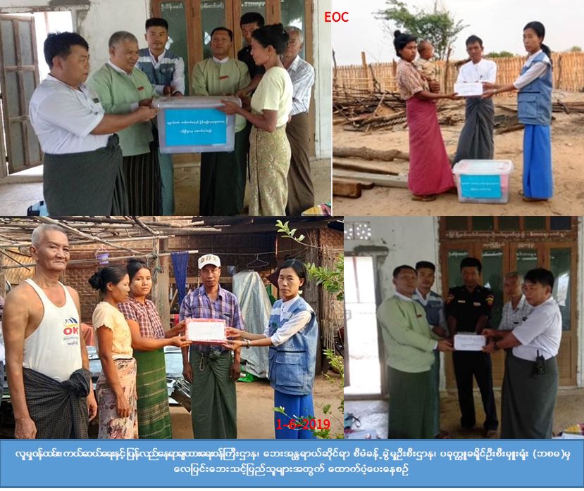 လူမှုဝန်ထမ်း၊ ကယ်ဆယ်ရေးနှင့် ပြန်လည်နေရာချထားရေးဝန်ကြီးဌာန၊ ဘေးအန္တရာယ် ဆိုင်ရာစီမံခန့်ခွဲမှု ဦးစီးဌာန၊ ပခုက္ကူခရိုင်ဦးစီးမှူးရုံးမှ တာဝန်ရှိသူများသည် ပခုက္ကူမြို့နယ်၊ ပန်းတိုင်းခြုံကျေးရွာအုပ်စု၊ မြောက်လူးကန်ကျေးရွာ၊ ကြီးရွာကျေးရွာအုပ်စု၊ကြီးရွာကျေးရွာ၊ပေါင်လောင်ကန်ကျေးရွာများတွင် (၃၀-၅-၂၀၁၉)ရက်နေ့ (၁၇:၀၀) နာရီအချိန်၌ လေပြင်းတိုက်ခတ်မှုကြောင့် ပြိုကျအိမ်ခြေ(၁)လုံး၊အမိုးလန်ပျက်စီးခဲ့ သည့် အိမ်ခြေ (၇) လုံး၊ အိမ်ထောင်စု (၈) စု၊ လူဦးရေ (၃၇) ဦးတို့အား ဆန်ရိက္ခာ (၇) ရက်စာဖိုး (၇၇,၇၀၀) ကျပ်၊ အိမ်ဆောက်ပစ္စည်းဖိုး (၃၄၀,၀၀၀) ကျပ်၊ စုစုပေါင်း (၄၁၇,၇၀၀)ကျပ်နှင့် ကယ်ဆယ်ရေးပစ္စည်း(၁၅)မျိုး၊အိမ်ထောင်စု(၁)စုစာတို့အား (၃၁-၅-၂၀၁၉) ရက်နေ့တွင် ကျေးရွာအုပ်စုအုပ်ချုပ်ရေးမှူး များထံ၌ ဘေးသင့်ပြည်သူများ လက်ဝယ်အရောက် ထောက်ပံ့ပေးအပ်ခဲ့ခြင်းအားလည်းကောင်း၊ ရေစကြိုမြို့နယ်၊ ကွေ့ထောင့်ကျေးရွာအုပ်စု၊ ကွေ့ထောင်ကျေးရွာ၊ ထန်းငယ်တောကျေးရွာအုပ်စု၊ဥက္ကံကျေးရွာ၊ ထန်းငယ်တောကျေးရွာ၊ သဲတောကျေးရွာများတွင် (၃၀-၅-၂၀၁၉)ရက်နေ့ (၁၇:၃၀) နာရီအချိန်၌ လေပြင်းတိုက်ခတ်မှုကြောင့် အမိုးလန်ဘုန်းကြီးကျောင်း(၁)ကျောင်း၊ ပြိုကျအိမ်ခြေ(၂)လုံး၊အမိုးလန်ပျက်စီးခဲ့သည့် အိမ်ခြေ (၅၀) လုံး၊ အိမ်ထောင်စု (၅၂) စု၊ လူဦးရေ (၂၄၂) ဦးတို့အား ဆန်ရိက္ခာ (၇) ရက်စာဖိုး (၅၀၈,၂၀၀) ကျပ်၊ ကျောင်း/အိမ်ဆောက်ပစ္စည်းဖိုး (၁,၀၂၀,၀၀၀) ကျပ်၊ စုစုပေါင်း (၁,၅၂၈,၂၀၀)နှင့် ကယ်ဆယ်ရေးပစ္စည်း(၁၅)မျိုး၊အိမ်ထောင်စု(၂)စုစာတို့အား (၃၁-၅-၂၀၁၉) ရက်နေ့တွင် ပခုက္ကူခရိုင် အထွေထွေအုပ်ချုပ်ရေးဦးစီးဌာန၊ ခရိုင်အုပ်ချုပ်ရေးမှူး၊ဦးကျော်အံ့မောင်နှင့်တာဝန်ရှိသူများ၊ပခုက္ကူခရိုင်ပြည်သူ့ဆက်ဆံရေးနှင့်ပြန်ကြားရေး ဦးစီးဌာနမှတာဝန်ရှိသူ၊ရေစကြိုမြို့နယ်အထွေထွေအုပ်ချုပ်ရေးဦးစီးဌာန၊မြို့နယ်အုပ်ချုပ်ရေးမှူး၊ဦးအောင်မြင်နှင့် တာဝန်ရှိသူများ၊ ကျေးရွာအုပ်စုအုပ်ချုပ်ရေးမှူးများနှင့်အတူ ဘေးသင့်ပြည်သူများ လက်ဝယ်အရောက် အသီးသီး ထောက်ပံ့ပေးအပ်ခဲ့ပါသည်။