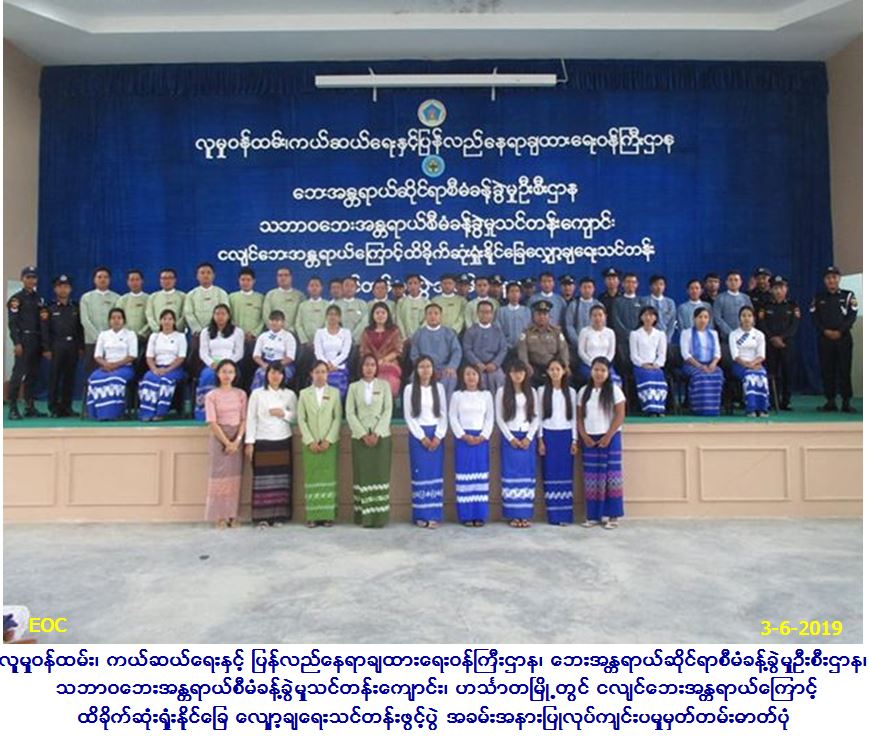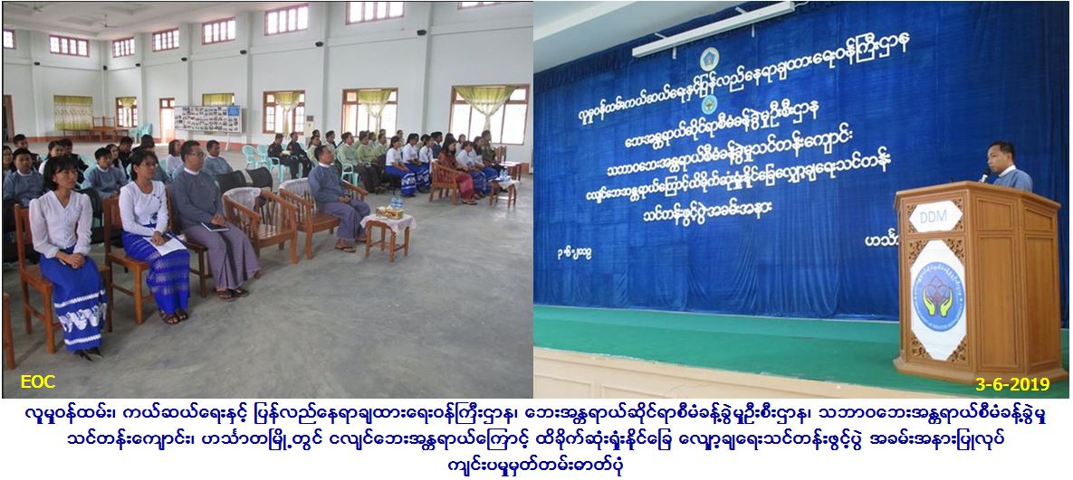 လူမှုဝန်ထမ်း၊ ကယ်ဆယ်ရေးနှင့် ပြန်လည်နေရာချထားရေးဝန်ကြီးဌာန၊ ဘေးအန္တရာယ်ဆိုင်ရာစီမံခန့်ခွဲမှုဦးစီးဌာန၊ သဘာဝဘေးအန္တရာယ် စီမံခန့်ခွဲမှု သင်တန်းကျောင်း၊ ဟင်္သာတမြို့၌ (၃.၆.၂၀၁၉)နေ့ နံနက်(၀၈း၃၀)နာရီအချိန်တွင် ငလျင်ဘေးအန္တရာယ်ကြောင့် ထိခိုက်ဆုံးရှုံးနိုင်ခြေ လျှော့ချရေးသင်တန်းဖွင့်ပွဲ အခမ်း အနားပြုလုပ်ခဲ့ရာ သင်တန်းကျောင်းကျောင်း အုပ်ကြီးမှ သင်တန်းဖွင့်အမှာစကားပြောကြားခဲ့ပြီး UNDPမှ တာဝန်ရှိသူများ၊ ခရိုင်အဆင့်ဌာနဆိုင်ရာ များ၊ သင်တန်းနည်းပြများ၊ သင်တန်းသား/ သင်တန်းသူ(၄၃)ဦးအပါအဝင် စုစုပေါင်း (၅၀)ဦးခန့် တက်ရောက်ခဲ့ပါကြောင်း သတင်းရရှိပါသည်။