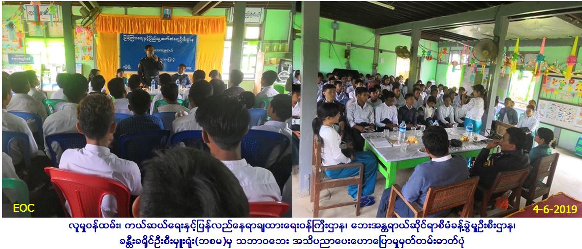 လူမှုဝန်ထမ်း၊ ကယ်ဆယ်ရေးနှင့်ပြန်လည်နေရာချ ထားရေးဝန်ကြီးဌာန၊ ဘေးအန္တရာယ်ဆိုင်ရာစီမံ ခန့့်ခွဲမှုဦးစီးဌာန၊ ခန္တီးခရိုင်ဦးစီးမှူးရုံးမှ တာဝန်ရှိသူများသည် ခန္တီးခရိုင်ပြန်ကြားရေးနှင့် ပြည်သူ့ဆက်ဆံရေးဦးစီးဌာနမှ ကျင်းပပြုလုပ် သည့် သဘာဝပတ်ဝန်းကျင် ထိန်းသိမ်းရေးနေ့ အကြို သဘာဝဘေးအန္တရာယ်ဆိုင်ရာ အသိပညာပေးဆွေးနွေးဟောပြောပွဲတွင် ခရိုင်မီးသတ်ဦးစီးဌာန၊ ခရိုင်လူမှုဝန်ထမ်းဦးစီးဌာန၊ မြို့နယ် အမျိုးသမီးရေးရာအဖွဲ့ဝင်တို့နှင့်အတူ (၄-၆-၂၀၁၉) ရက်နေ့ (၀၉း၀၀)နာရီအချိန်တွင် ခန္တီးခရိုင်ပြန်ကြားရေးနှင့် ပြည်သူ့ဆက်ဆံရေးဦးစီး ဌာန ခန်းမ၌ ကျောင်းသူ၊ ကျောင်းသား (၁၂၀) ဦးတို့အား အသိပညာပေးလုပ်ငန်း များဆောင်ရွက်ခဲ့ပါကြောင်း သတင်းရရှိပါသည်။