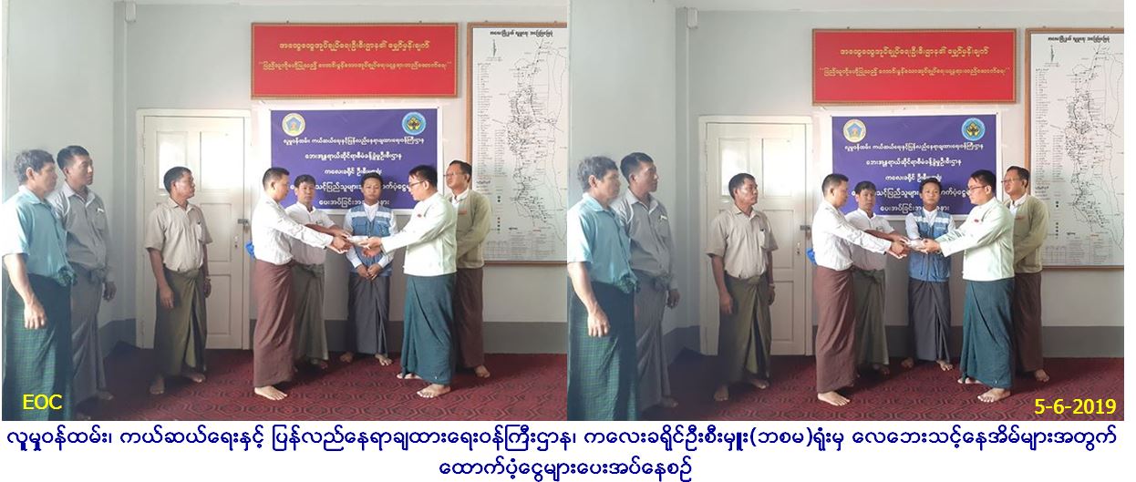 လူမှုဝန်ထမ်း၊ ကယ်ဆယ်ရေးနှင့် ပြန်လည်နေရာချထားရေးဝန်ကြီးဌာန၊ ဘေးအန္တရာယ်ဆိုင်ရာစီမံခန့်ခွဲမှု ဦးစီးဌာန၊ ကလေးခရိုင်ဦးစီးမှူးရုံးမှ တာဝန်ရှိသူများသည် ကလေးမြို့နယ် အင်ဒိုင်းကြီးကျေးရွာအုပ်စု၊ မော်လိုက်ကလေးအုပ်စု၊ ကျောင်းတိုက်အုပ်စု၊ ဆည်တော်ဦးကျေးရွာ တို့တွင် (၂-၆-၂၀၁၉)ရက်နေ့တွင် ဖြစ်ပွားခဲ့သော လေဘေးသင့်အိမ်ခြေ (၂၃)လုံး၊ ပြိုကျဘုန်းတော်ကြီး ကျောင်း (၁) ကျောင်းနှင့် အမိုးလန် ဘုန်းတော်ကြီးကျောင်း (၁)ကျောင်းတို့အတွက် စုစုပေါင်းထောက်ပံ့ငွေ (၁,၀၈၅,၀၀၀/-) ကျပ်တို့အား (၅-၆-၂၀၁၉) ရက်နေ့တွင် ကလေး မြို့နယ်အထွေထွေ အုပ်ချုပ်ရေးဦးစီး ဌာနမှ တာဝန်ရှိ သူများရှေ့မှောက်တွင် သက်ဆိုင်ရာ ကျေးရွာအုပ်ချုပ်ရေးမှူးစာရေးများထံသို့ လွှဲပြောင်း ထောက်ပံ့ပေးအပ်ခဲ့ကြောင်း သတင်ရရှိပါသည်။