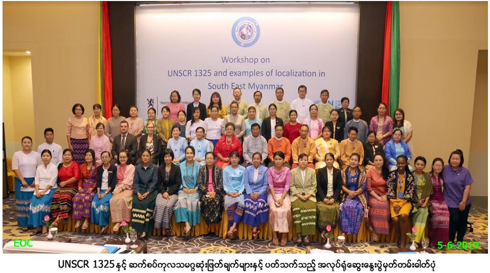 ယနေ့အလုပ်ရုံ ဆွေးနွေးပွဲကို မြန်မာနိုင်ငံလုံးဆိုင်ရာ အမျိုးသမီးကော်မတီနှင့် UN Women တို့ ပူးပေါင်းပြီး UNSCR 1325နှင့် ဆက်စပ်ကုလသမဂ္ဂ ဆုံးဖြတ်ချက်များအရ ဆောင်ရွက်သွားမည့် လုပ်ငန်းစဉ်များနှင့်ပတ်သက်၍ ရှင်းလင်းဆွေးနွေးနိုင်ရန်အတွက် ကျင်းပပြု လုပ်ခဲ့ခြင်းဖြစ်ပါသည်။ ဒုတိယဝန်ကြီးက အမှာစကားပြောကြားရာတွင် UNSCR1325 သည် အမျိုးသမီးများအား နည်းမျိုးစုံဖြင့် ခွဲခြားမှု ပပျောက်ရေးဆိုင်ရာကုလသမဂ္ဂကွန်ဗင်းရှင်းနှင့် ဘေဂျင်းလုပ်ငန်းစီမံချက်များပေါ် တွင်အခြေပြုကာ ၂၀၀၀ ပြည့်နှစ်တွင် ချမှတ်ခဲ့ပြီး UNSCR1325 အပါအဝင်ဆက်စပ် ကုလသမဂ္ဂ ဆုံးဖြတ်ချက်စုစုပေါင်း(၅)ခုရှိပါကြောင်း၊ UNSCR 1325နှင့် ဆက်စပ်ကုလသမဂ္ဂဆုံးဖြတ်ချက်များမှာ ငြိမ်းချမ်းရေးတည်ဆောက်ခြင်း လုပ်ငန်းစဉ်များတွင်အမျိုးသမီးများအနေနှင့် ဆုံးဖြတ်ချက်ချမှတ်နိုင်သည့်အဆင့်များတွင် ပါဝင်မှုရှိစေရေး၊ အမျိုးသမီးများနှင့် အမျိုးသမီးငယ်ရွယ်များအား လိင်ပိုင်းဆိုင်ရာနှင့် ကျား၊ မရေးရာအခြေပြု အကြမ်းဖက်မှုများမှ ကာကွယ်စောင့်ရှောက်မှုပေးရေး၊ အမျိုးသမီးအခွင့်အရေးများအတွက် တာဝန်ယူမှု၊ တာဝန်ခံမှုရှိ စေရေးတို့ ဖော်ပြပါရှိပါကြောင်း၊ အမျိုးသမီးများဖွံ့ဖြိုးတိုးတက်ရေးဆိုင်ရာ အမျိုးသားအဆင့် မဟာဗျူဟာစီမံကိန်း(၂၀၁၃-၂၀၂၂)အရ ဖွဲ့စည်းထားသည့် အမျိုးသမီး၊ ငြိမ်းချမ်းရေးနှင့် လုံခြုံရေး ဆိုင်ရာနည်းပညာလုပ်ငန်းအဖွဲ့ပူးပေါင်းပါဝင်မှု၊ UN Women၏ ပံ့ပိုးမှုဖြင့် UNSCR 1325 ဆက်စပ် ကုလသမဂ္ဂဆုံးဖြတ်ချက်များ အကောင်အထည်ဖော်နိုင်ရေးအတွက် အမျိုးသားအဆင့်လုပ်ငန်း စီမံချက်ကို ရေးဆွဲနိုင် ရေးအတွက်လည်း စီစဉ်ဆောင်ရွက်လျက်ရှိပါကြောင်း၊ စီမံချက်ကိုရေးဆွဲရာ တွင်လည်း ကဏ္ဍစုံမှ ပါဝင်အကြံပြုဆွေးနွေးပေးစေလိုပါကြောင်း၊ နော်ဝေနိုင်ငံအစိုးရ၏ ပံ့ပိုးမှုဖြင့် မွန်ပြည်နယ်၊ ကရင်ပြည်နယ်နှင့် ကယားပြည်နယ်တို့တွင် UN Women က အကောင်အထည်ဖော် ဆောင်ရွက်လျက်ရှိသည့် “ Centering Women and Their Priorities in Myanmar’s Peace Process Phase II (၂၀၁၇-၂၀၂၀) စီမံချက်ဟာ UNSCR 1325နှင့် ဆက်စပ်ကုလသမဂ္ဂ ဆုံးဖြတ်ချက်များအား အကောင်အထည်ဖော်ရာတွင်များစွာ အထောက် အကူဖြစ် မှာဖြစ်ပါကြောင်း၊ စီမံချက် Phase II ဆောင်ရွက်ရာတွင် Phase I ၏ အောင်မြင်မှု၊ စိန်ခေါ်မှုများနှင့် ချိတ်ဆက်ဆောင်ရွက်နိုင်ရန် အရေးကြီးပါကြောင်း၊ Monitoring and Evaluation တွင် အရေးပါ ပါကြောင်း၊ Review လုပ်ရန်လိုအပ်ပါကြောင်း ပြောကြားခဲ့ပါသည်။