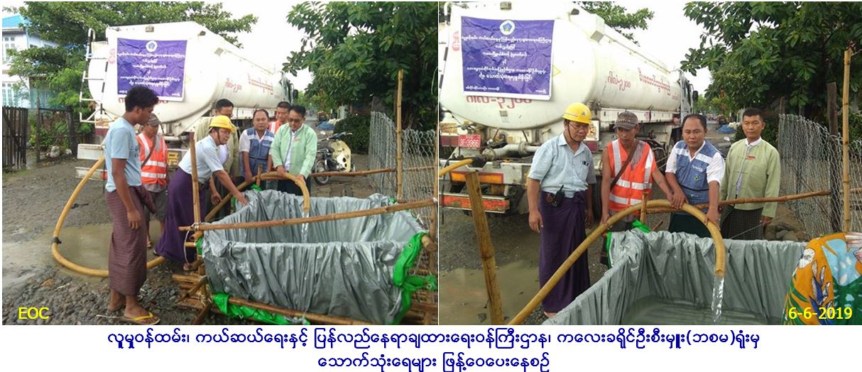 လူမှုဝန်ထမ်း၊ ကယ်ဆယ်ရေးနှင့် ပြန်လည်နေရာချထားရေးဝန်ကြီးဌာန၊ ဘေးအန္တရာယ်ဆိုင်ရာစီမံခန့်ခွဲမှုဦးစီးဌာန၊ ကလေးခရိုင်ဦးစီးမှူးရုံးမှ တာဝန်ရှိသူများသည် ကလေးမြို့နယ်စီမံခန့်ခွဲမှုကော်မတီဥက္ကဌ၊ မြို့နယ်အုပ်ချုပ်ရေးမှူးနှင့်အတူ ပူးပေါင်း၍ (၆.၆.၂၀၁၉)ရက်နေ့ နံနက်(၀၉း၀၀)နာရီတွင် စစ်ကိုင်းတိုင်းဒေသကြီး၊ ကလေးမြို့နယ်၊ တာဟန်းရပ်ကွက်ရှိ အိမ်ခြေ(၂၂၁၃)၊ အိမ်ထောင်စု(၂၂၅၈)၊ လူဦးရေ (၁၁၀၂၇)ဦးအတွက် သောက်သုံးရေဂါလံ (၉၆၀၀)အား သွားရောက်ဖြန့်ဝေပေးခဲ့ပါကြောင်း သတင်းရရှိပါသည်။