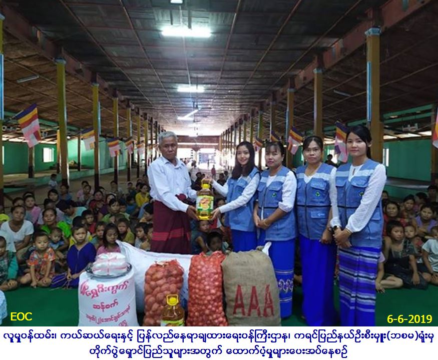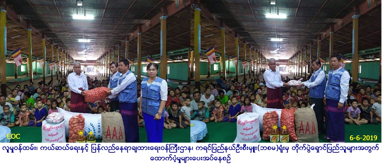 လူမှုဝန်ထမ်း၊ ကယ်ဆယ်ရေးနှင့် ပြန်လည်နေရာချထားရေးဝန်ကြီးဌာန၊ ဘေးအန္တရာယ်ဆိုင်ရာစီမံခန့်ခွဲမှုဦးစီးဌာန၊ ကရင်ပြည်နယ်ဦးစီးမှူးရုံးမှ တာဝန်ရှိသူများသည် (၆-၆-၂၀၁၉)ရက်နေ့တွင် လှိုင်းဘွဲမြို့နယ်၊ မြိုင်ကြီးငူအထူးဒေသတိုက်ပွဲရှောင်ကယ်ဆယ်ရေးစခန်းရှိ ဘေးသင့် အိမ်ထောင်စု (၈၇၁)စု လူဦးရေ(၅၂၈၁)ဦးတို့အတွက် (၆၁,၅၁၅,၂၀၀/-)တန်ဖိုးရှိ ဆန် (၁၇၇၀)အိတ်၊ ဆီငါးလီတာဘူး (၃၅၀)ဘူး၊ ကြက်သွန်နီ (၁၀၅၀)ပိဿာ၊ အာလူး (၁၀၅၀)ပိဿာ၊ အသားတု(၁၀၅၀)ပိဿာ၊ ပဲဝါခြမ်း(၃၀ပိဿာ) ၇၅အိတ်၊ ငရုတ်သီးခြောက်တောင့် (၁၈၀)ပိဿာ၊ အချိုမှုန့်ပေါင်ထုပ် (၃၃၀)ထုပ်နှင့် ဆား(၁၇၄၂)ထုပ်တို့အား သွားရောက်ထောက်ပံ့ပေးခဲ့ကြောင်း သတင်းရရှိ ပါသည်။